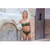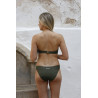 Modernus ir itin elegantiškas dviejų dalių maudymosi kostiumėlis, išsiskiriantis minimalistiniu dizainu ir subtilia tekstūra. Natūralus chaki atspalvis suteikia rafinuoto paprastumo, o bandeau tipo liemenėlė leidžia mėgautis tolygiu įdegiu.