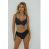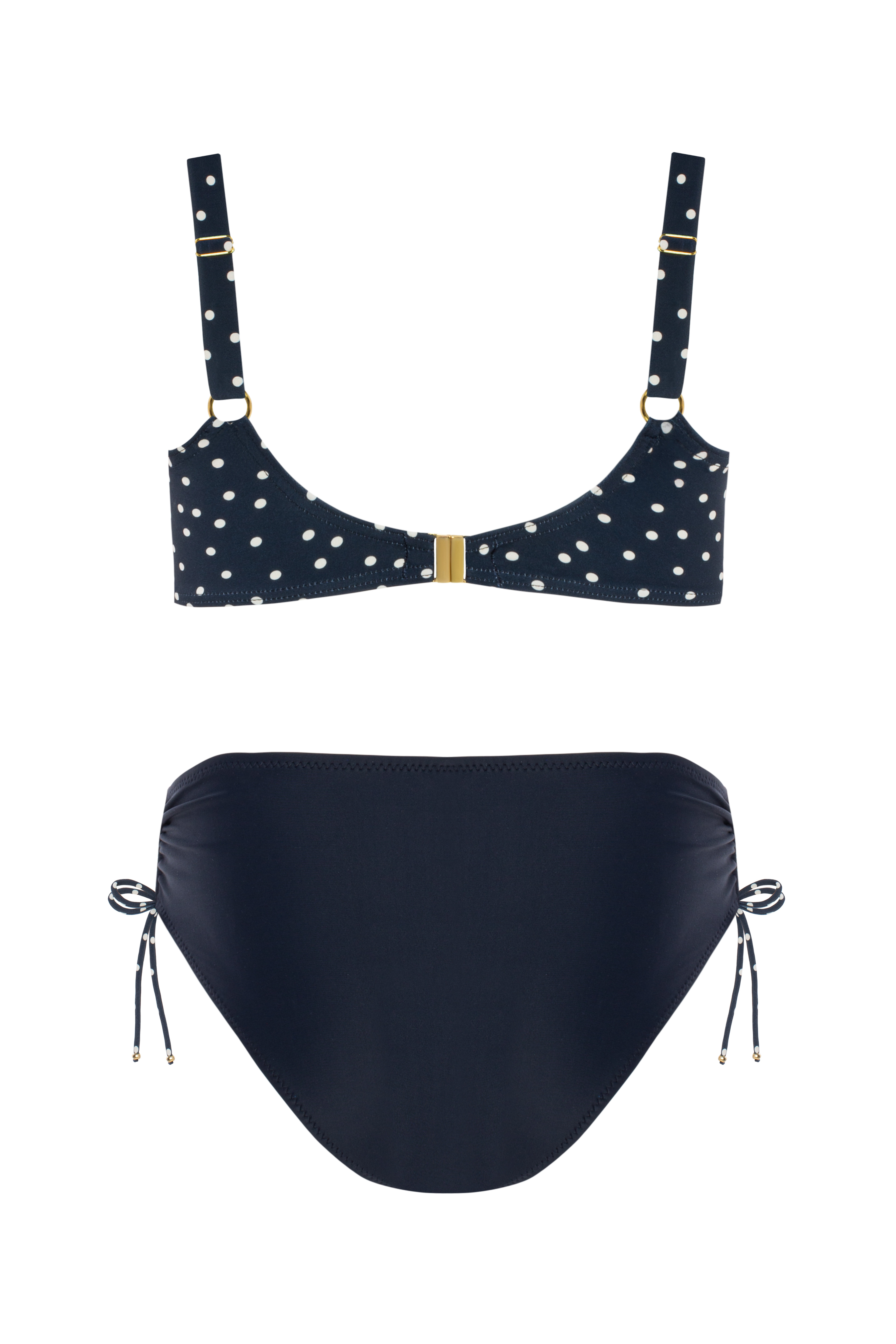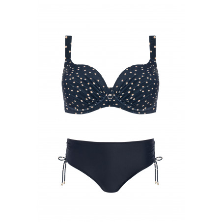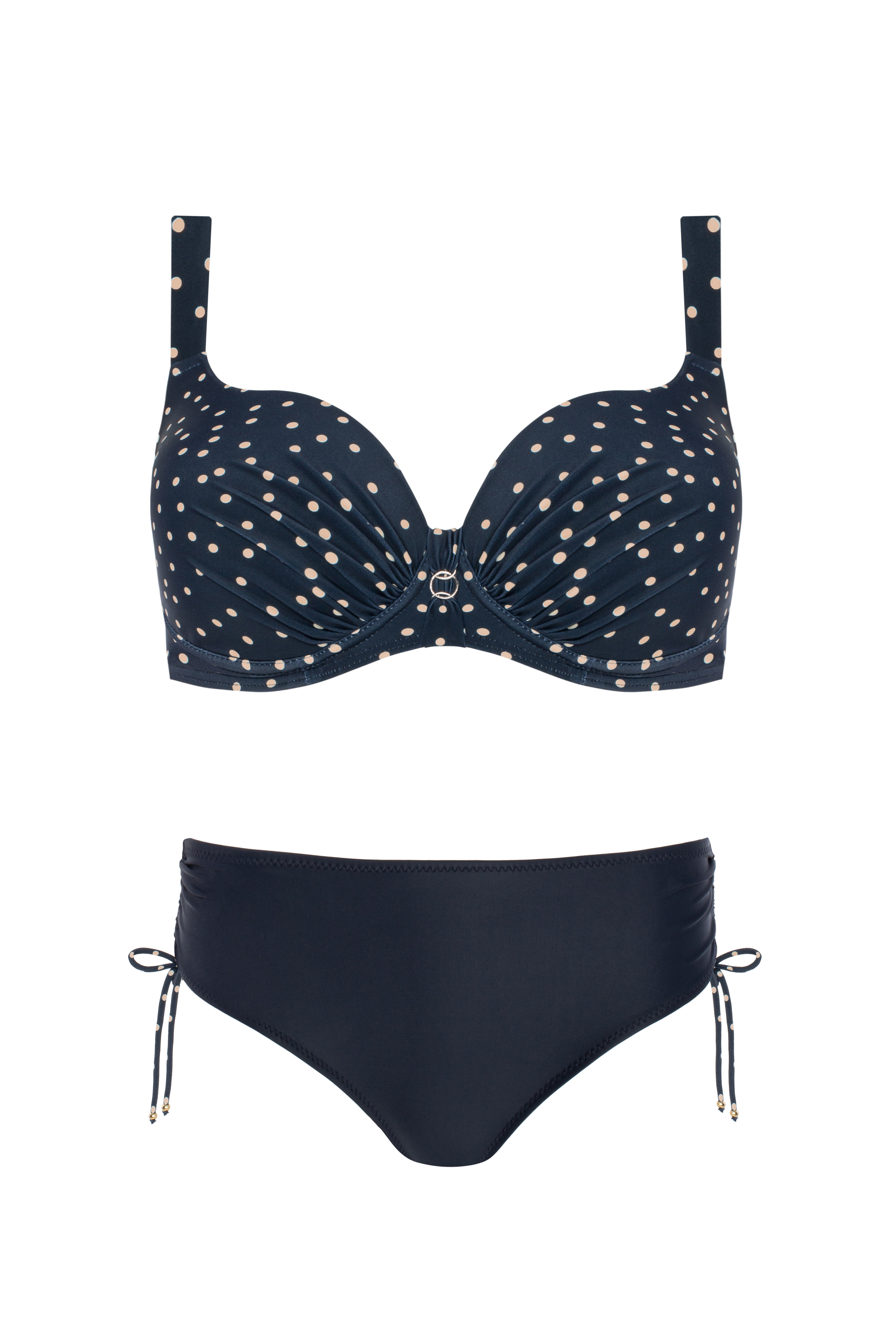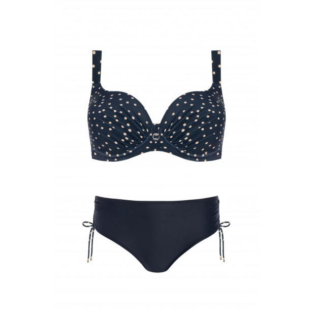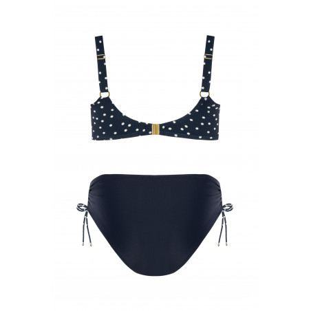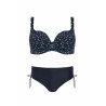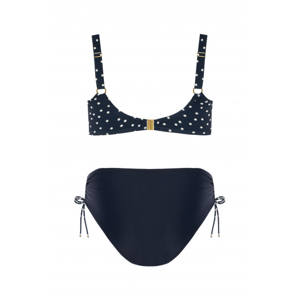 Šis stilingas modelis pasižymi paminkštintais kaušeliais, kurie gražiai formuoja ir palaiko krūtinę net ir sportuojant. Iškirptę puošia subtilus ekru spalvos taškelių raštas tamsiai mėlyname fone, o laisvai krintančios detalės sukuria harmoningą siluetą. Klasikinio kirpimo kelnaitės suteikia komforto ir tobulo prigludimo. Šis elegantiškas ir moteriškas komplektas yra universalus ir puikiai tinka paplūdimiui bei baseinui.