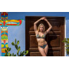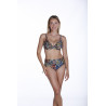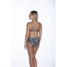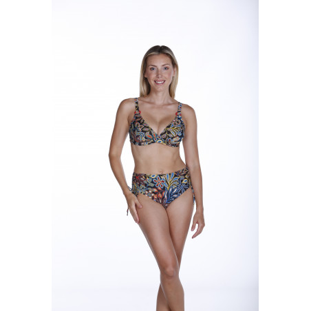 Ryškus ir elegantiškas dviejų dalių maudymosi kostiumėlis, išsiskiriantis spalvingais ornamentiniais motyvais. Tamsus fonas subtiliai kontrastuoja su įvairiaspalviais raštais, suteikdamas išskirtinumo ir rafinuoto stiliaus.