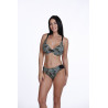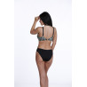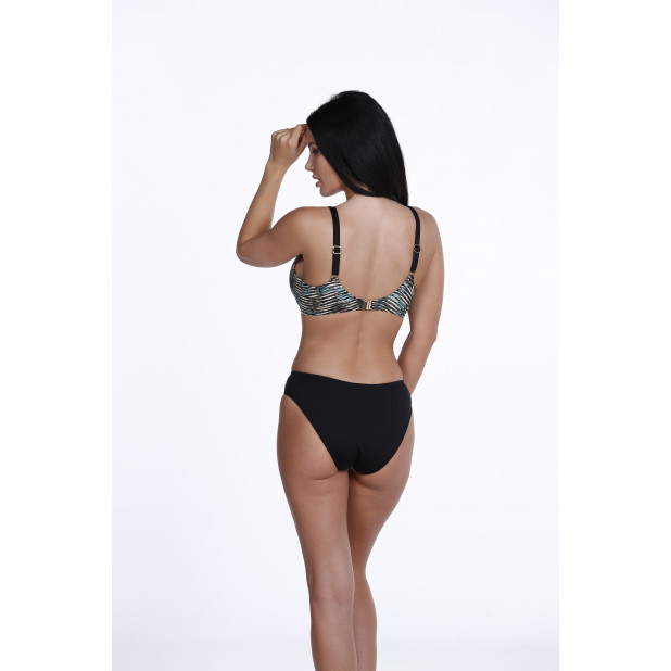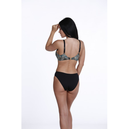 Stilingas ir patogus dviejų dalių maudymosi kostiumėlis, sukurtas pabrėžti moteriškas formas ir užtikrinti maksimalų komfortą. Modernus raštuotas viršus su juodos spalvos detalėmis suteikia išskirtinumo, o klasikinės juodos kelnaitės su dekoratyvine juostele subtiliai formuoja siluetą.