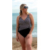 Šis elegantiškas vientisas maudymosi kostiumėlis pasižymi V formos iškirpte ir ryškiu apvyniojamu dizainu. Viršutinę dalį puošia subtilus ekru spalvos taškelių raštas tamsiai mėlyname fone, kuris kartu su asimetrine juosmens juosta gražiai formuoja siluetą. Maudymosi kostiumėlis turi paminkštintus kaušelius, kad būtų užtikrintas patikimas prilaikymas ir patogumas. Šis moteriškas ir elegantiškas stilius puikiai tinka moterims, kurios vertina eleganciją ir klasikinį retro stilių.