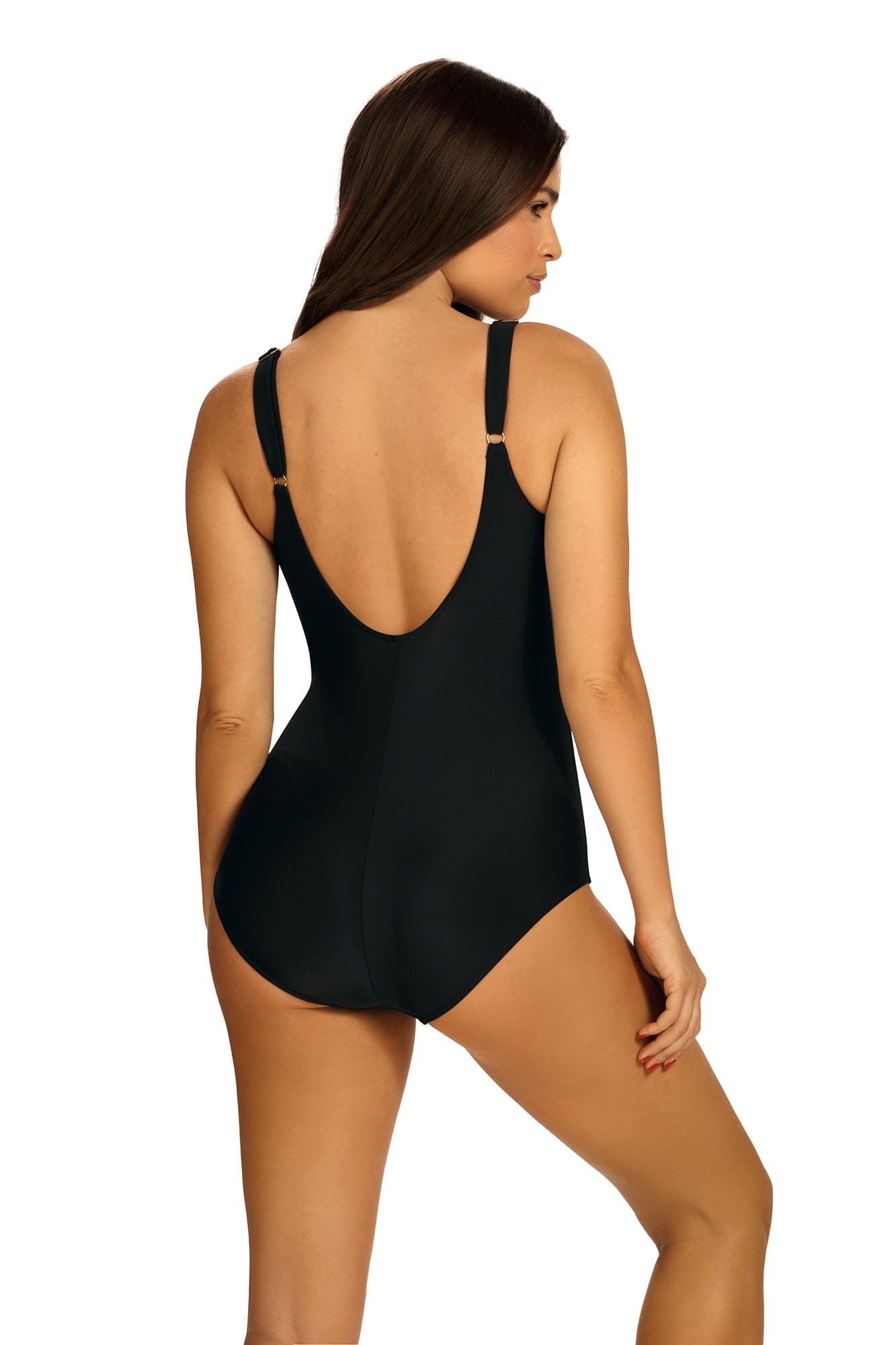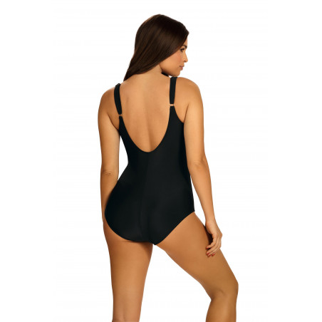 Šis maudymosi kostiumėlis pasižymi paminkštintais kaušeliais, kurie puikiai prilaiko krūtinę, ir specialia elastine juosta po krūtine, kuri papildomai formuoja siluetą. Priekinė dalis papuošta elegantiška sagtimi šone, suteikiančia visam kostiumėliui elegantišką išvaizdą. Priglundantis dizainas ir lašo formos nugara puikiai paryškina siluetą, sukurdami liekninimo efektą.