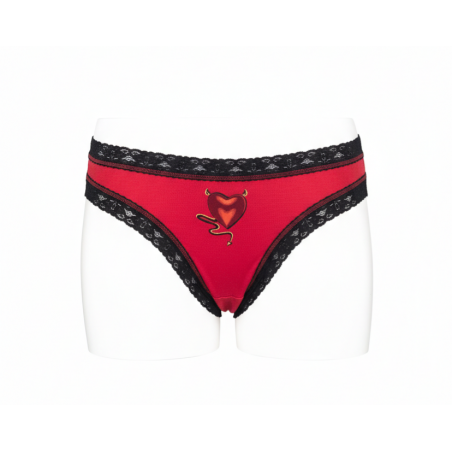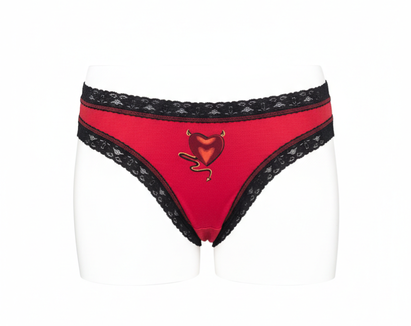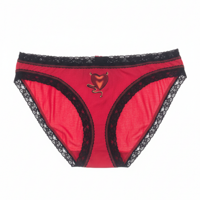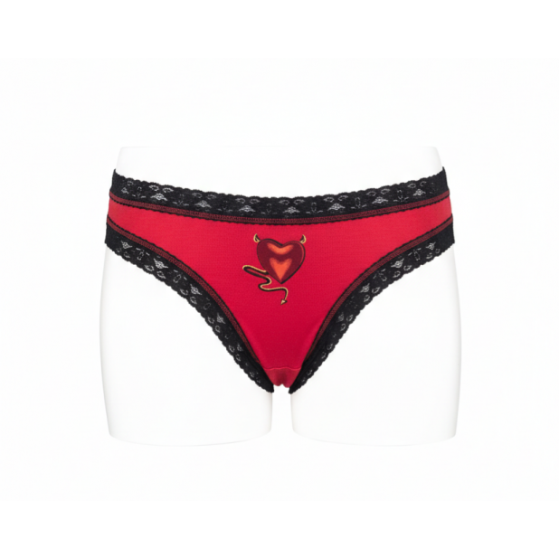 Suteikite savo apatiniam garderobui žaismingo žavesio! Šios ryškiai raudonos kelnaitės su subtiliais juodais nėriniais ir išskirtiniu „Devil Heart“ motyvu sukurtos moterims, kurios mėgsta jaustis patogiai ir kartu išskirtinai.