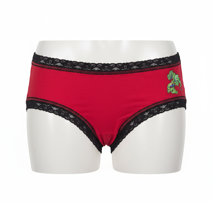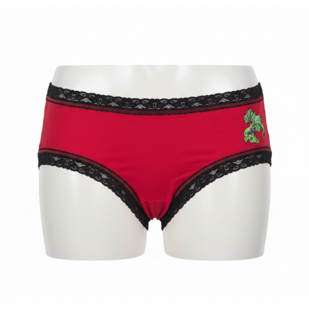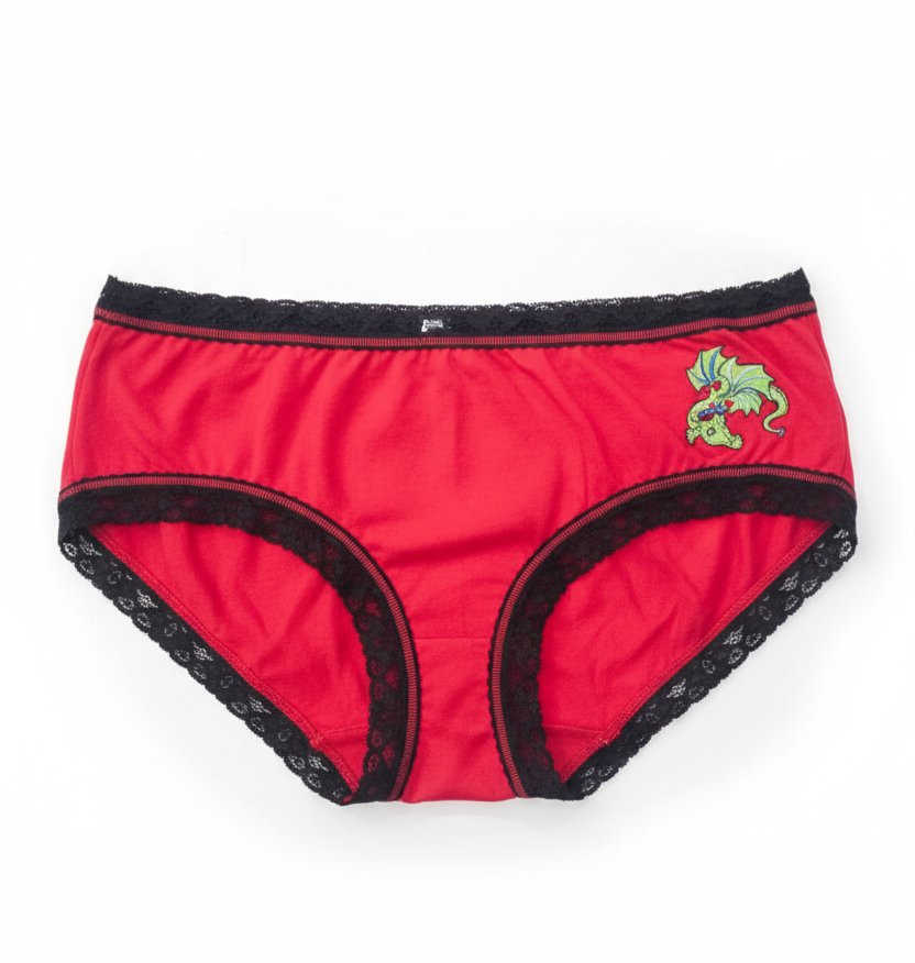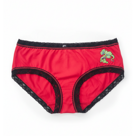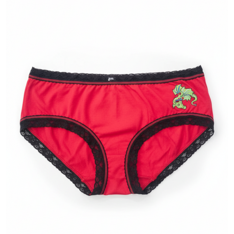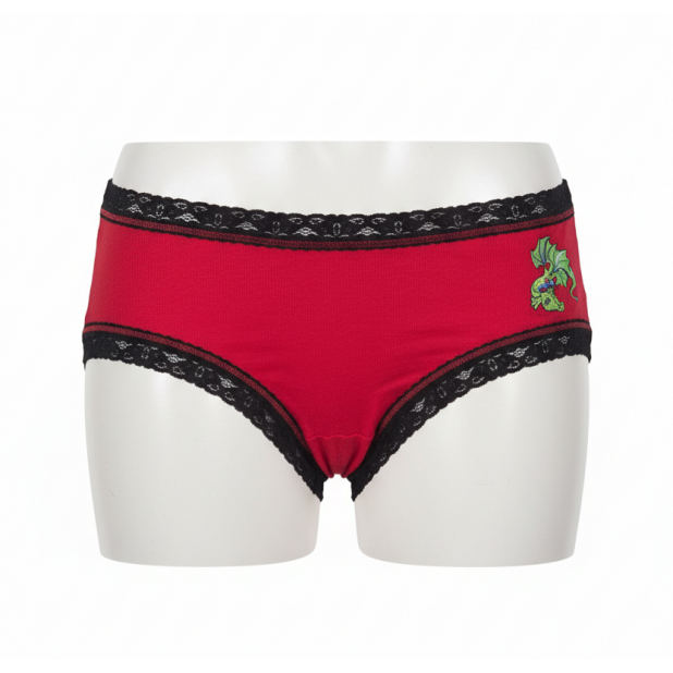 Patogios, stilingos ir išskirtinės – šios raudonos moteriškos kelnaitės su juodais nėriniais sukurtos moterims, kurios vertina komfortą ir originalų dizainą. Žaismingas drakono motyvas suteikia išskirtinumo ir charakterio, todėl šis modelis puikiai papildys jūsų apatinio trikotažo kolekciją.