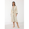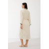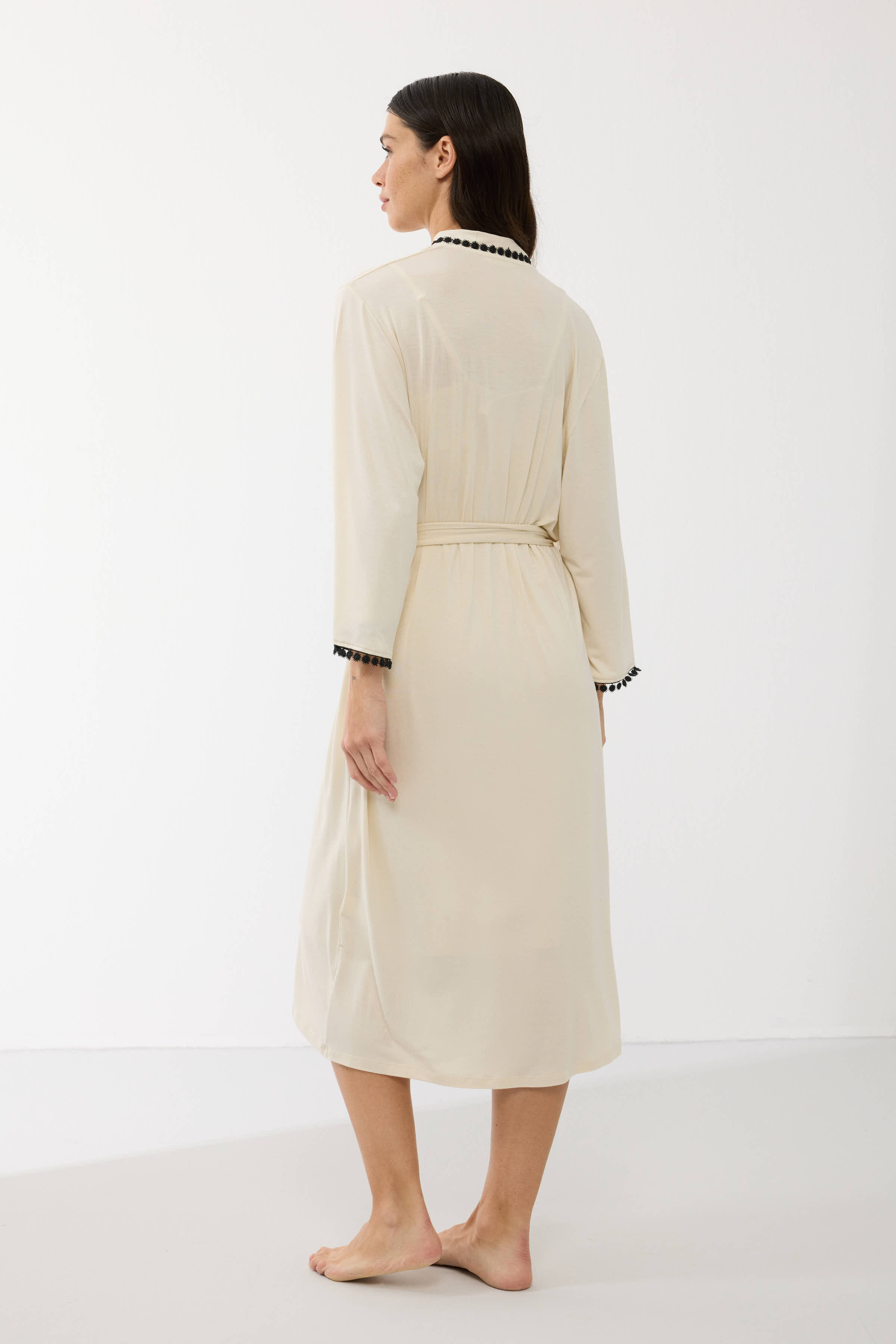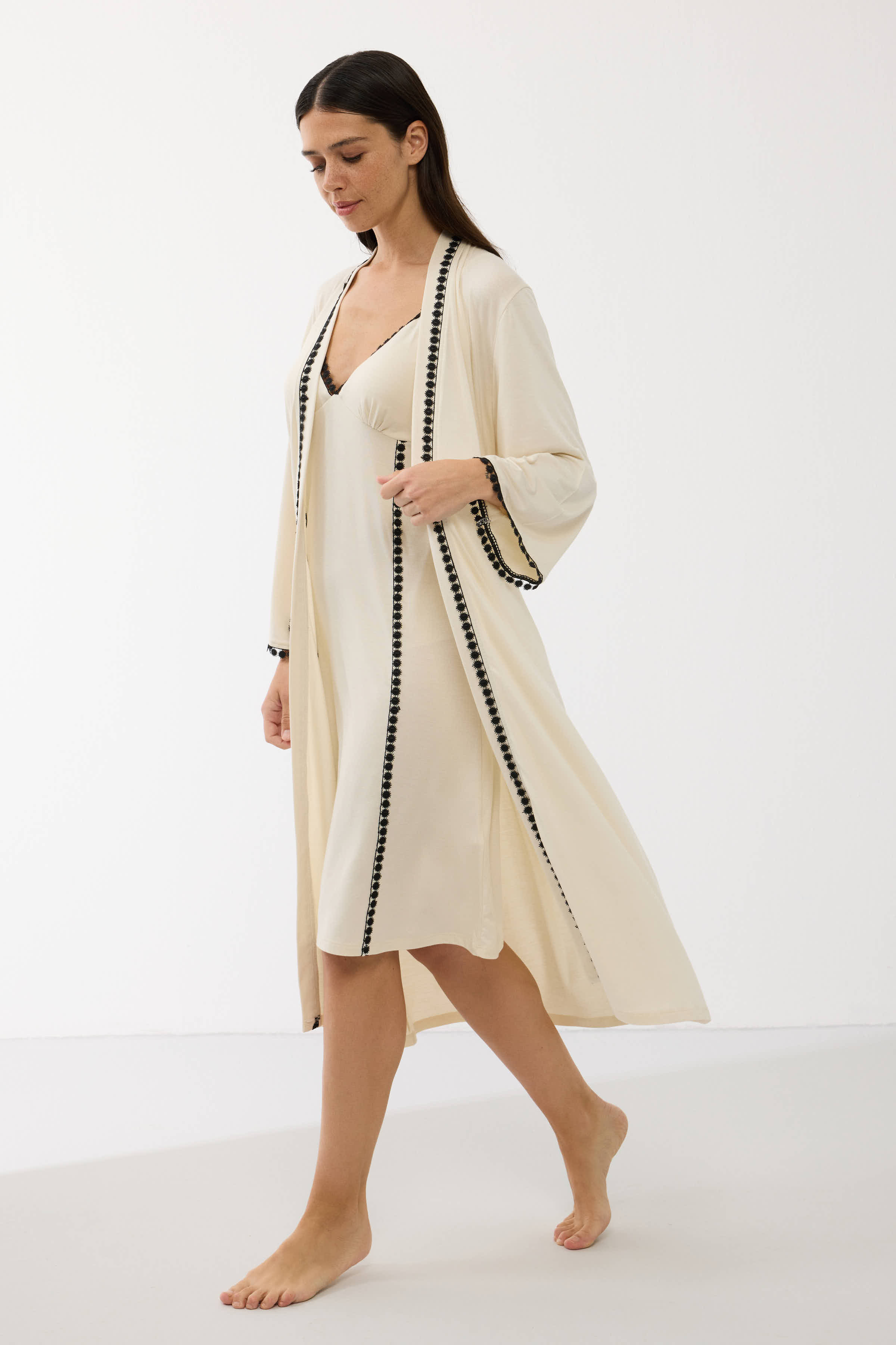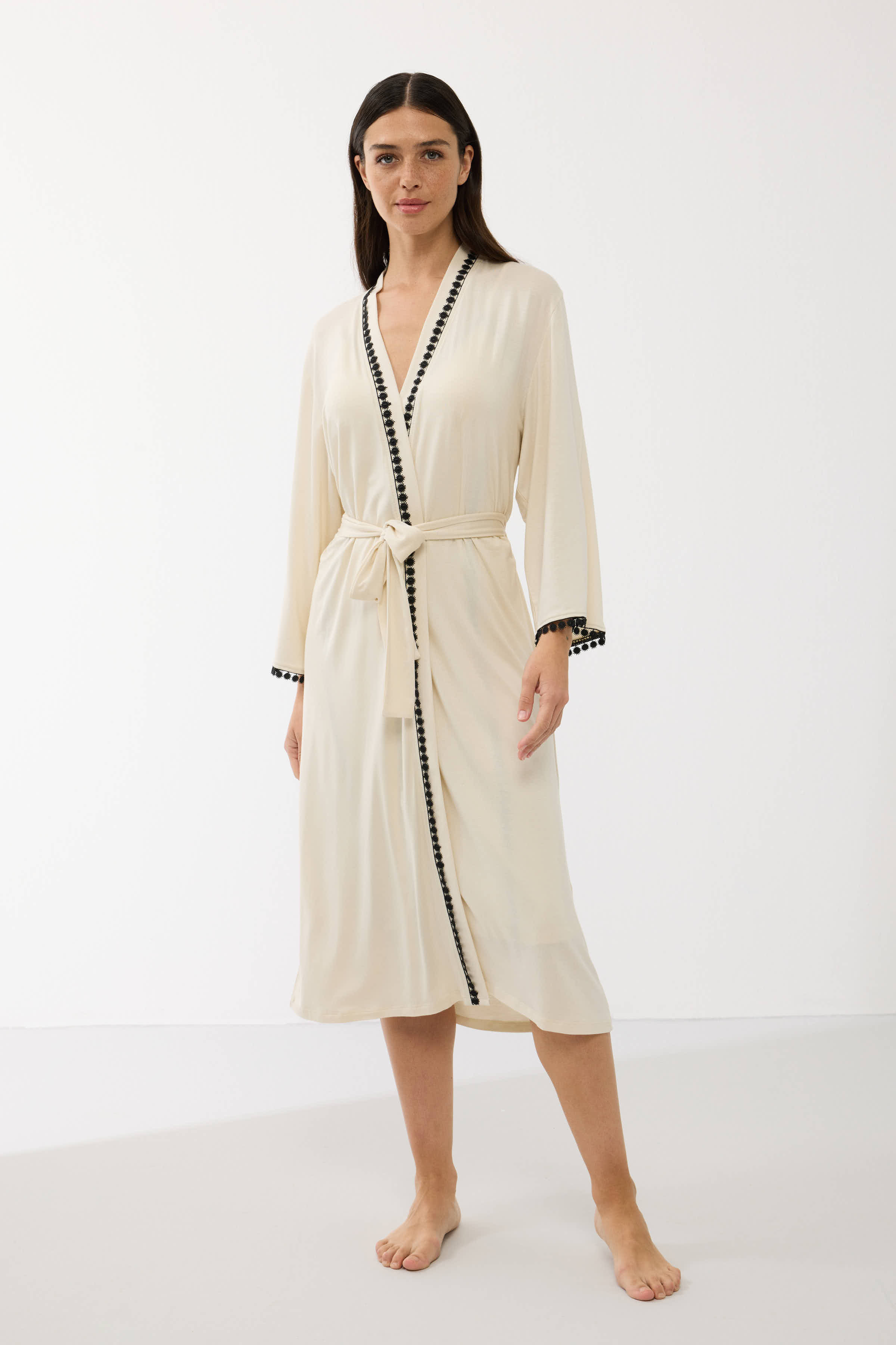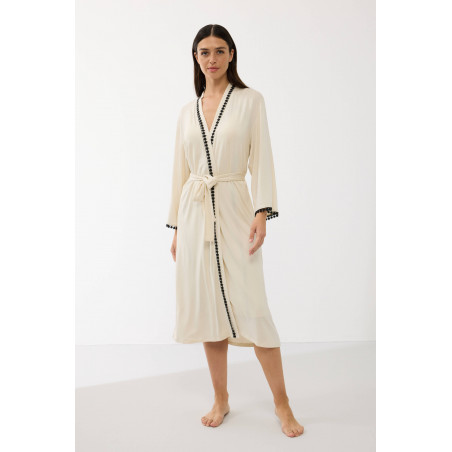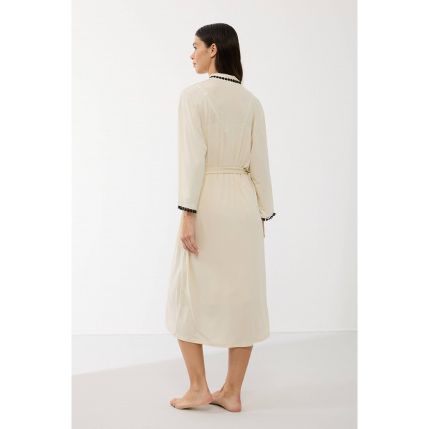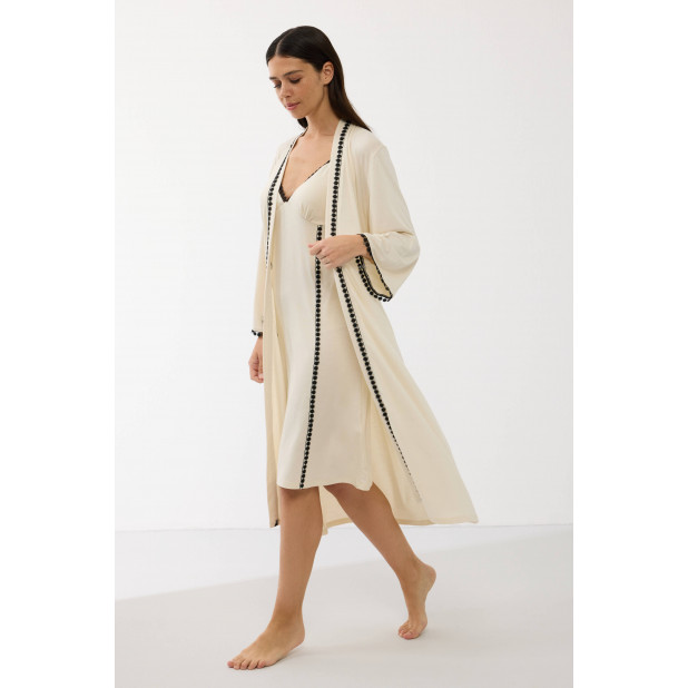 Kreminės spalvos audinys gražiai krinta ir maloniai priglunda prie kūno, o kontrastingos juodos dekoratyvinės juostelės išryškina siluetą. Chalatas susijuosia dirželiu ties liemeniu, todėl lengvai pritaikomas pagal figūrą. Platėjančios, laisvos rankovės suteikia lengvumo ir patogumo pojūtį.