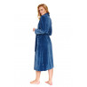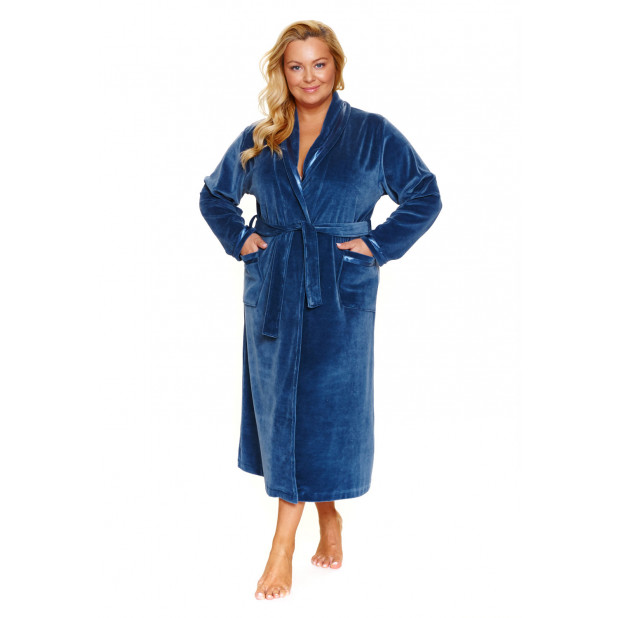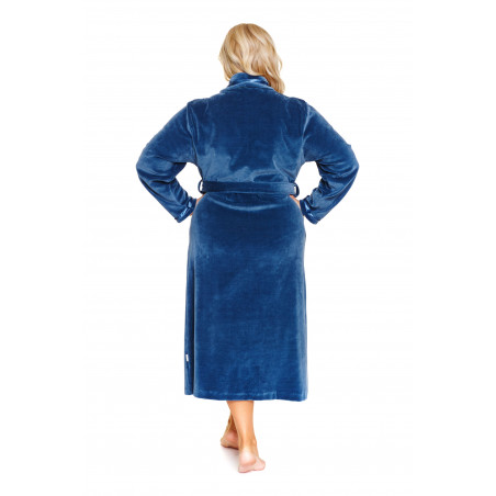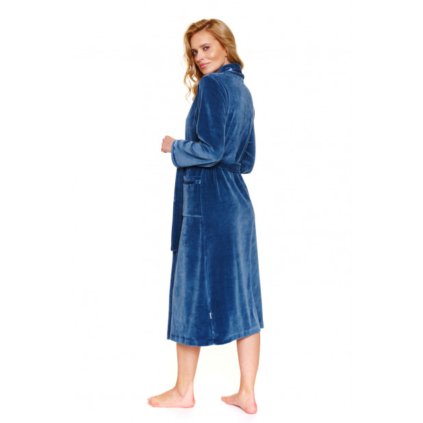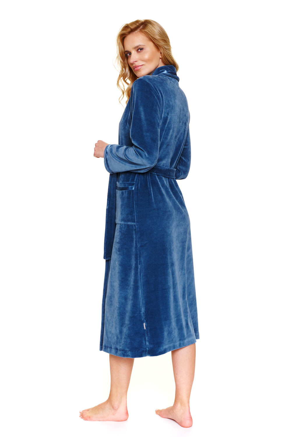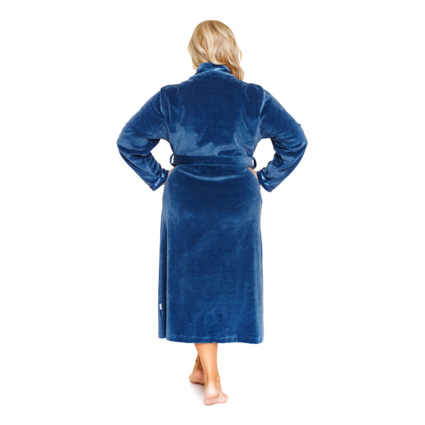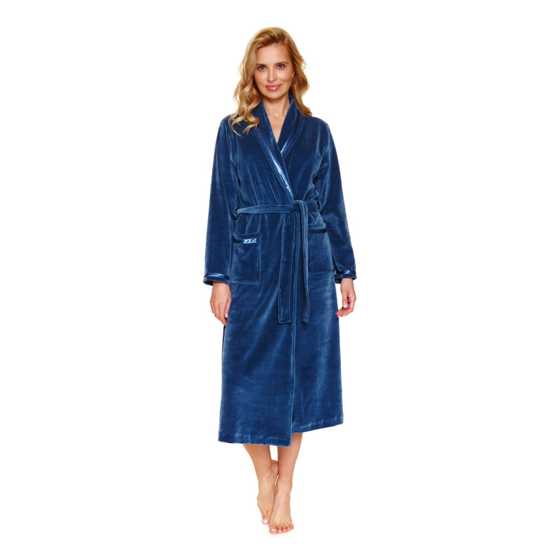 Mielas ir jaukus veliūro chalatas. Modelis ilgesnis, susijuosia dirželiu, su kišenėmis. Puoštas šilkinėmis juostelėmis. Medžiaga vidutinio storumo.