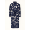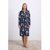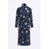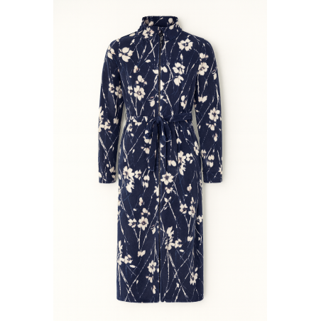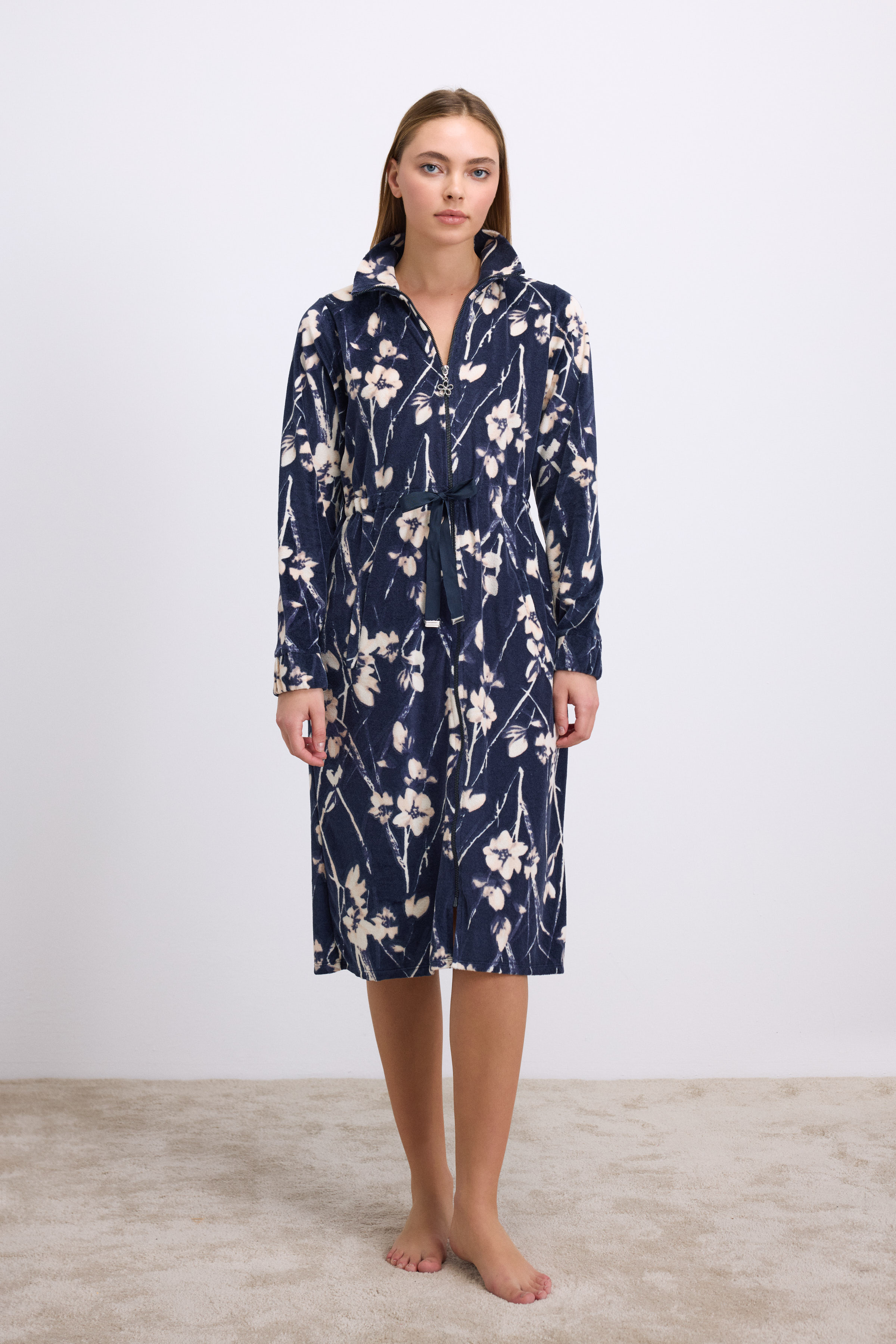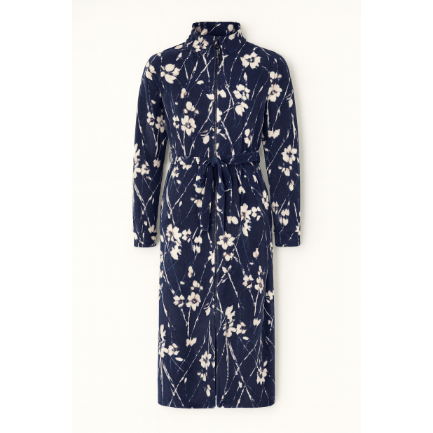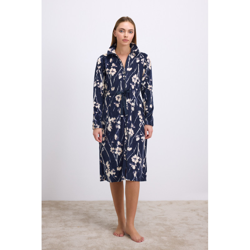 Minkštas, jaukus ir elegantiškas chalatas, puikiai tinkantis tiek rytui, tiek poilsio akimirkoms namuose. Audinys tamsiai mėlyno veliūrinio margintas šviesiais gėlių motyvais. Chalatas priekyje turi užtrauktuką su dekoratyviniu pakabuku. Dirželis ties juosmeniu leidžia pritaikyti siluetą pagal kūno formas.