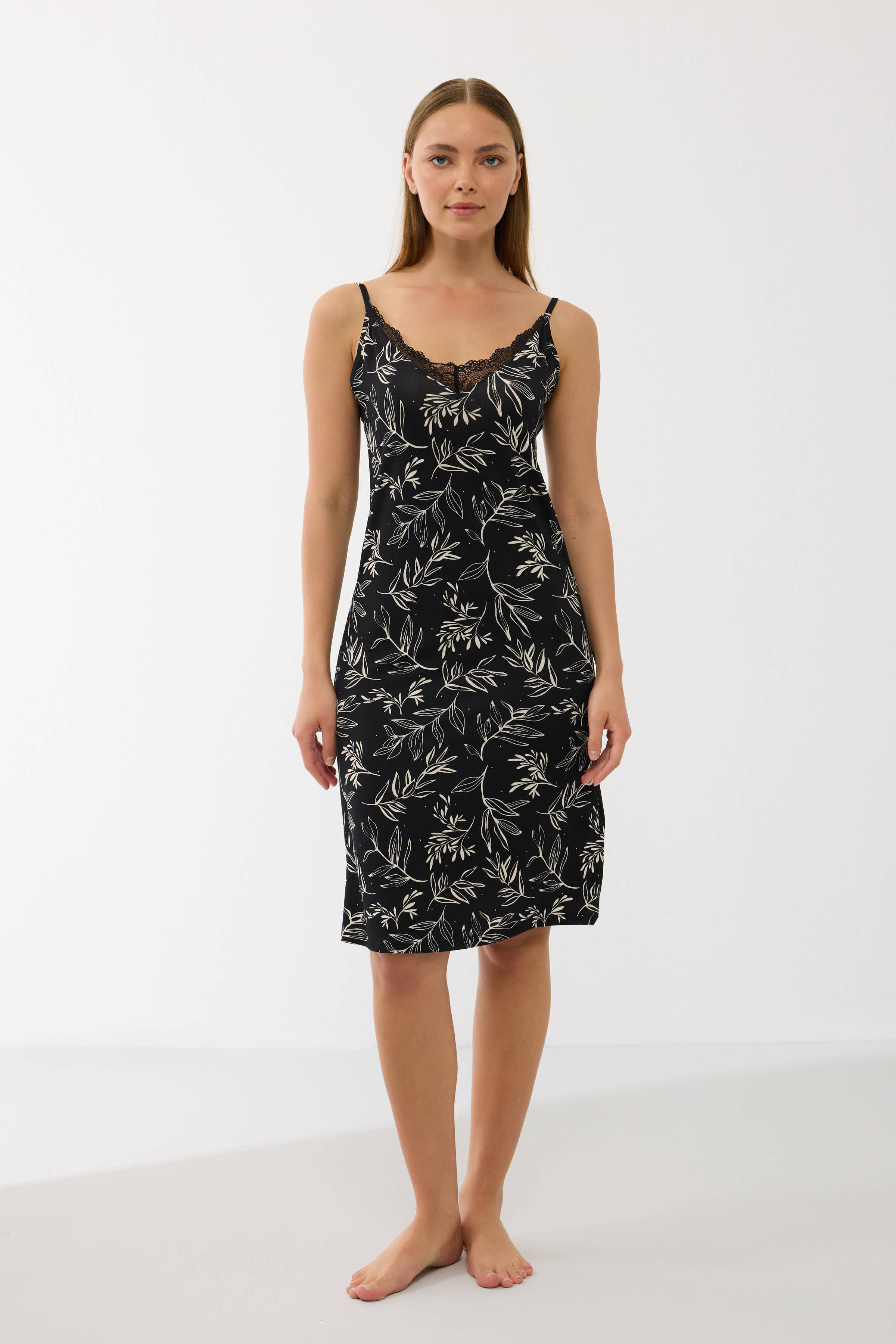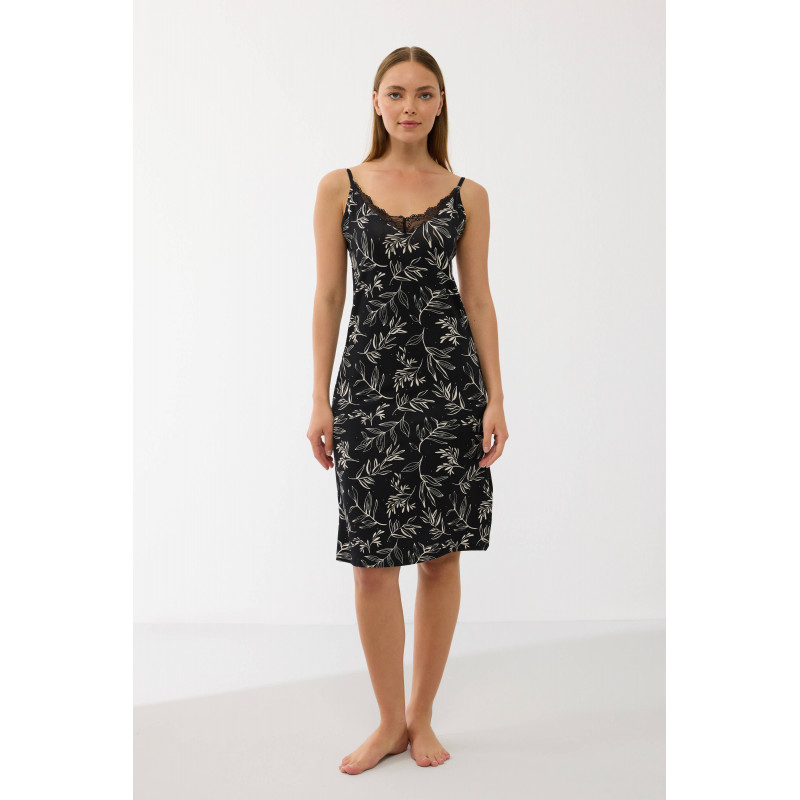 Viršutinę dalį puošia subtilūs nėriniai, išryškinantys dekoltė liniją ir suteikiantys romantiško žavesio. Plonos petnešėlės ir lengvai krintantis siluetas užtikrina komfortą bei nevaržo judesių, todėl jausitės patogiai visos nakties metu.
