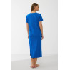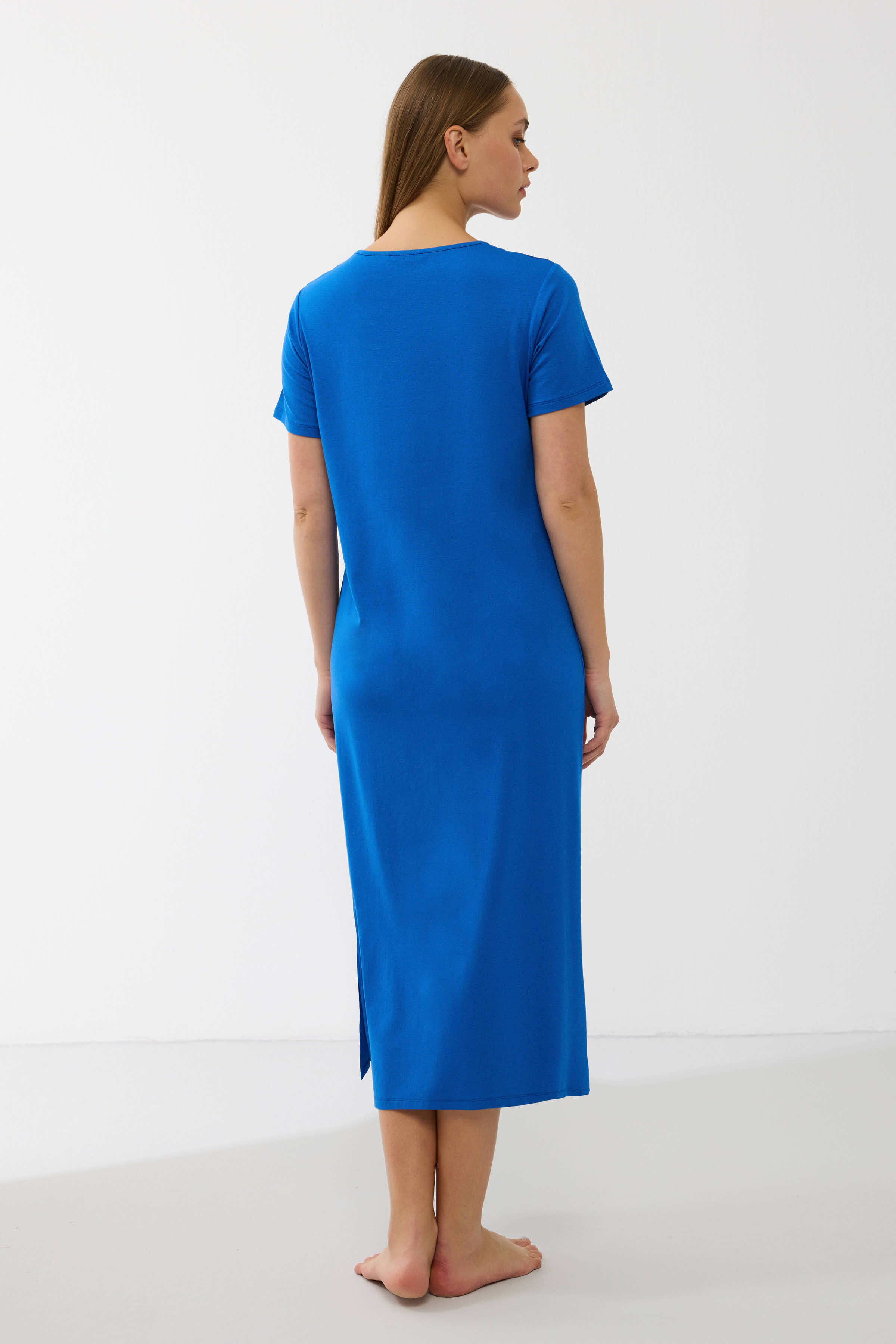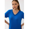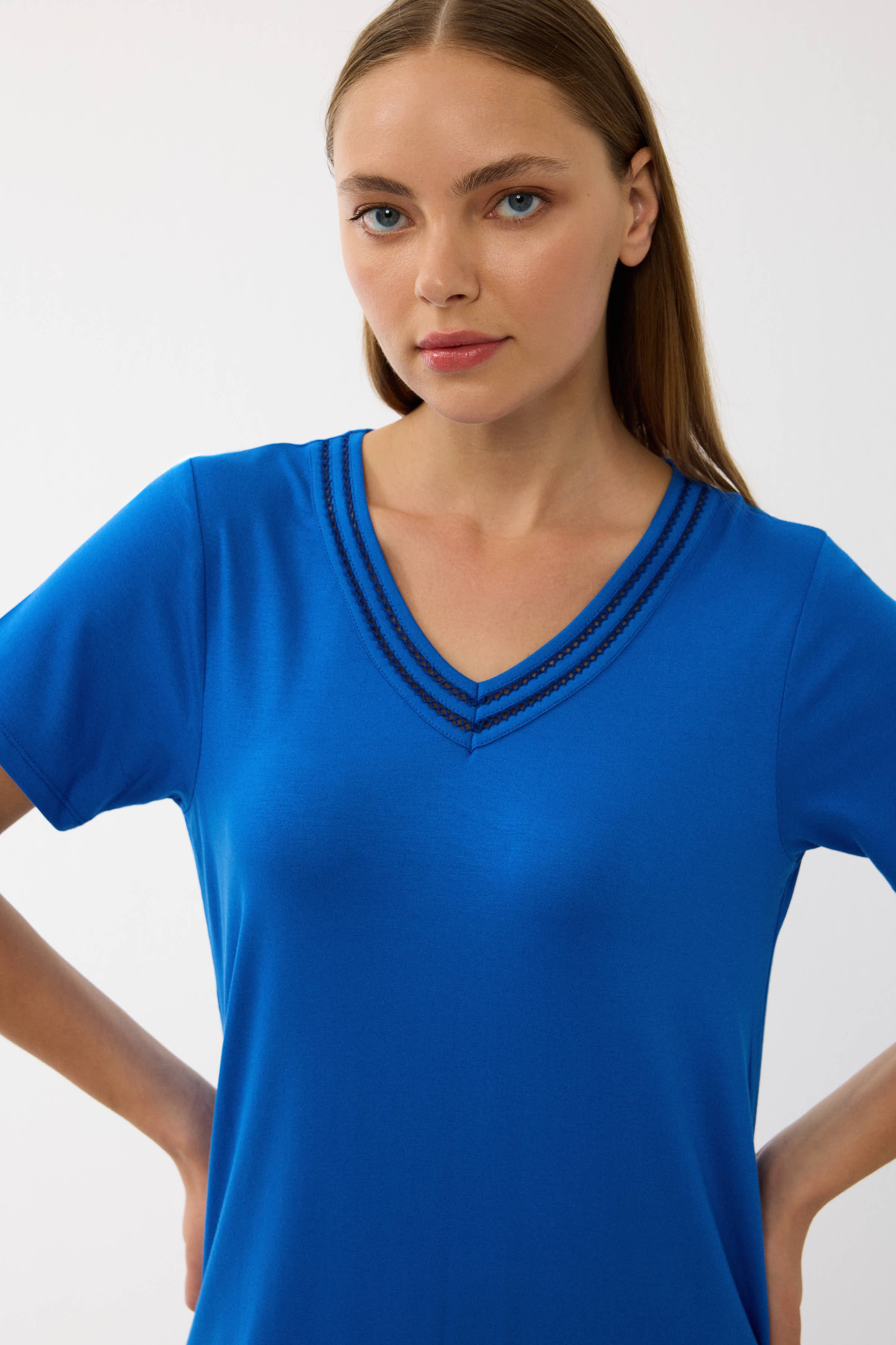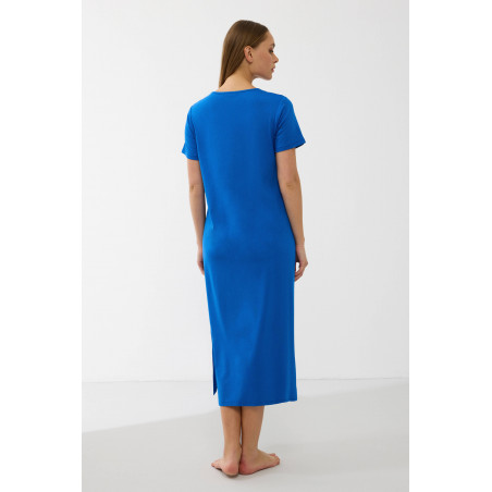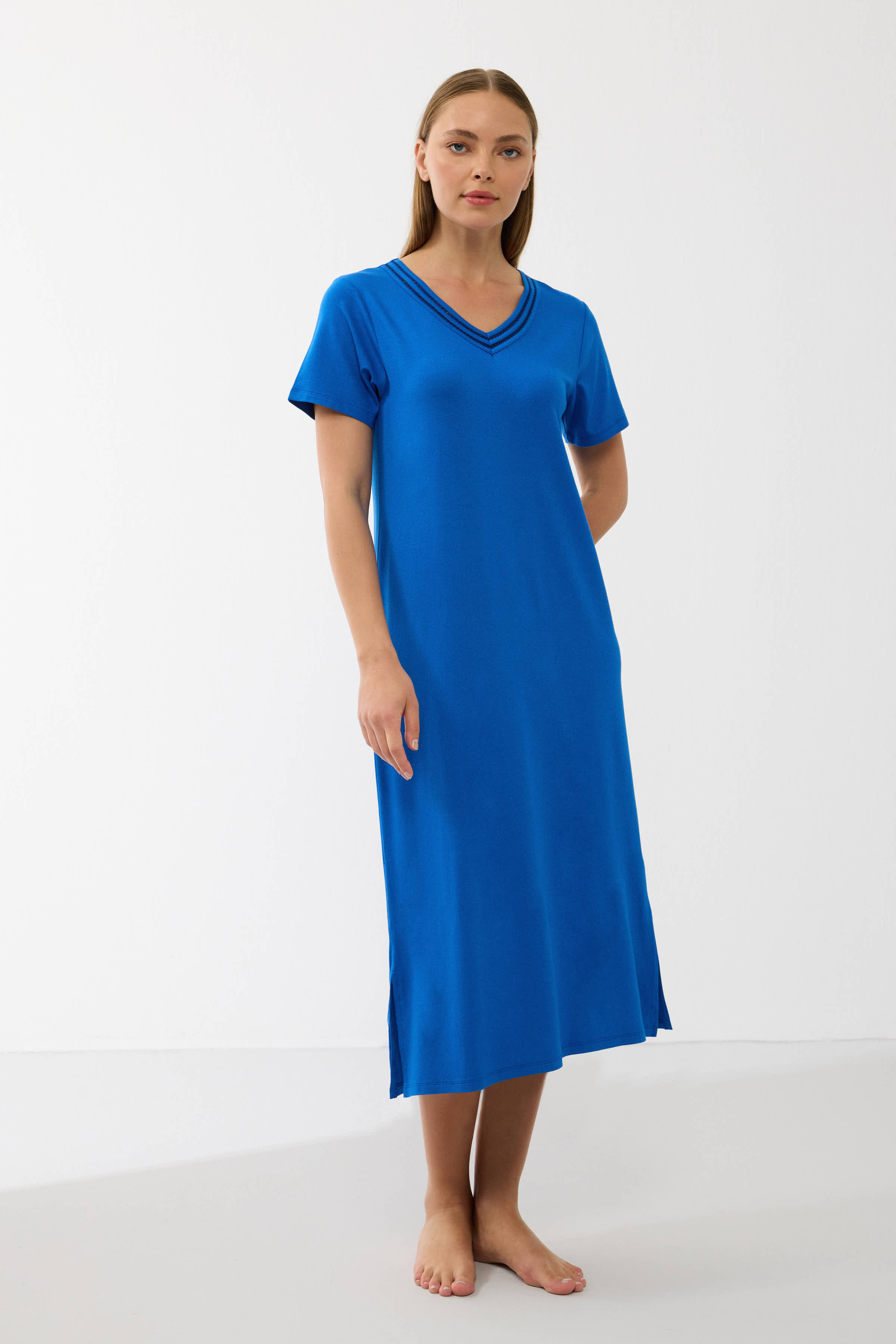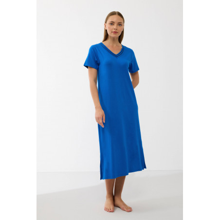 Sodrios mėlynos spalvos audinys suteikia gaivumo ir elegancijos, o V formos iškirptė su dekoratyvinėmis siūlėmis subtiliai išryškina kaklo liniją. Laisvas, tiesus siluetas nevaržo judesių ir leidžia kūnui atsipalaiduoti.