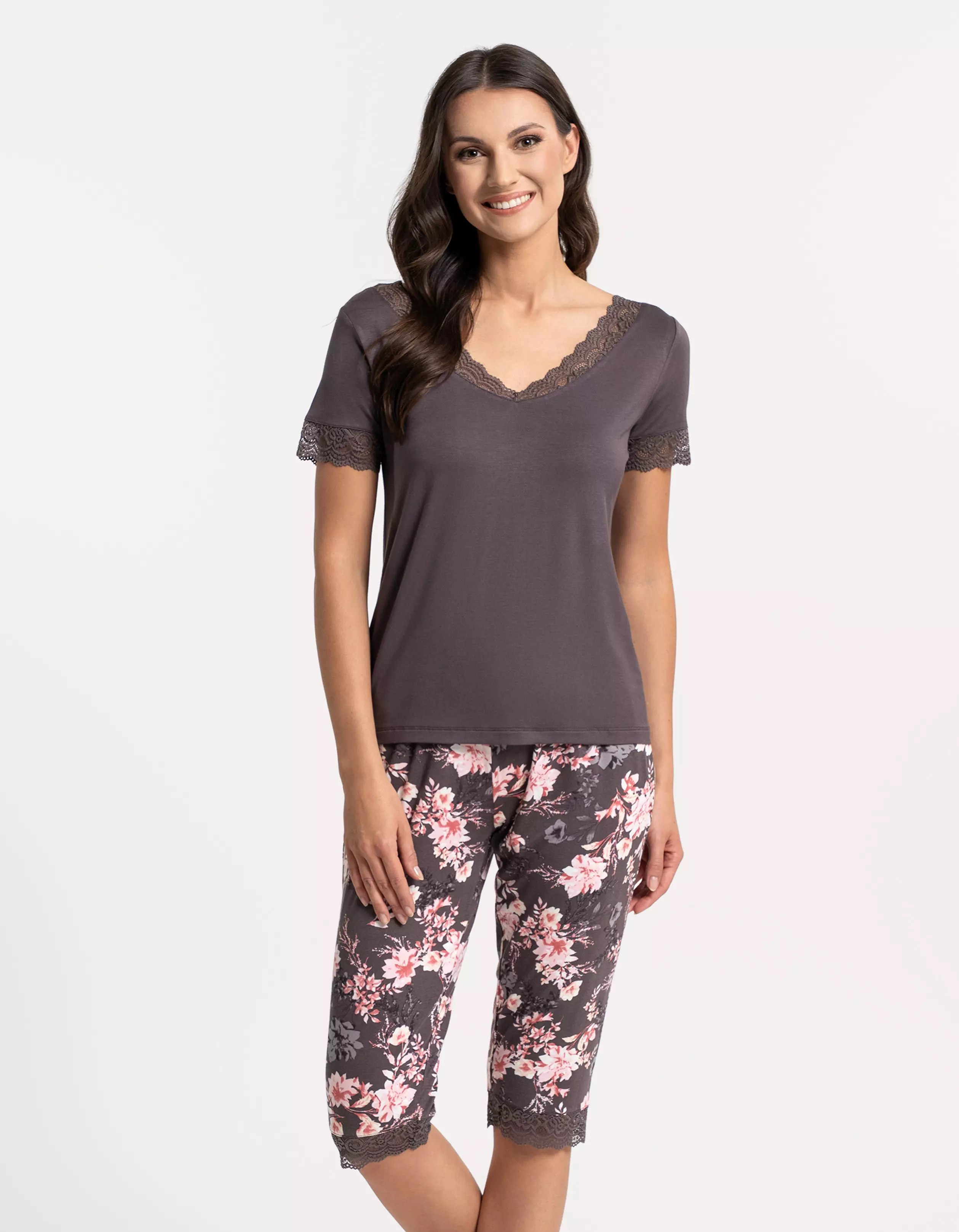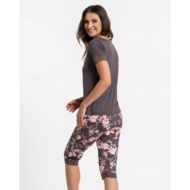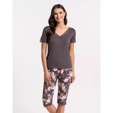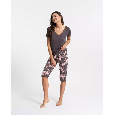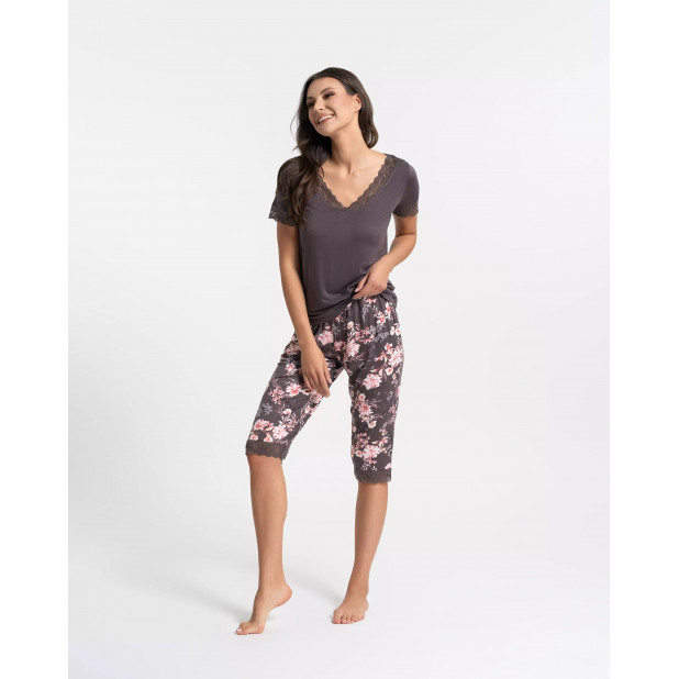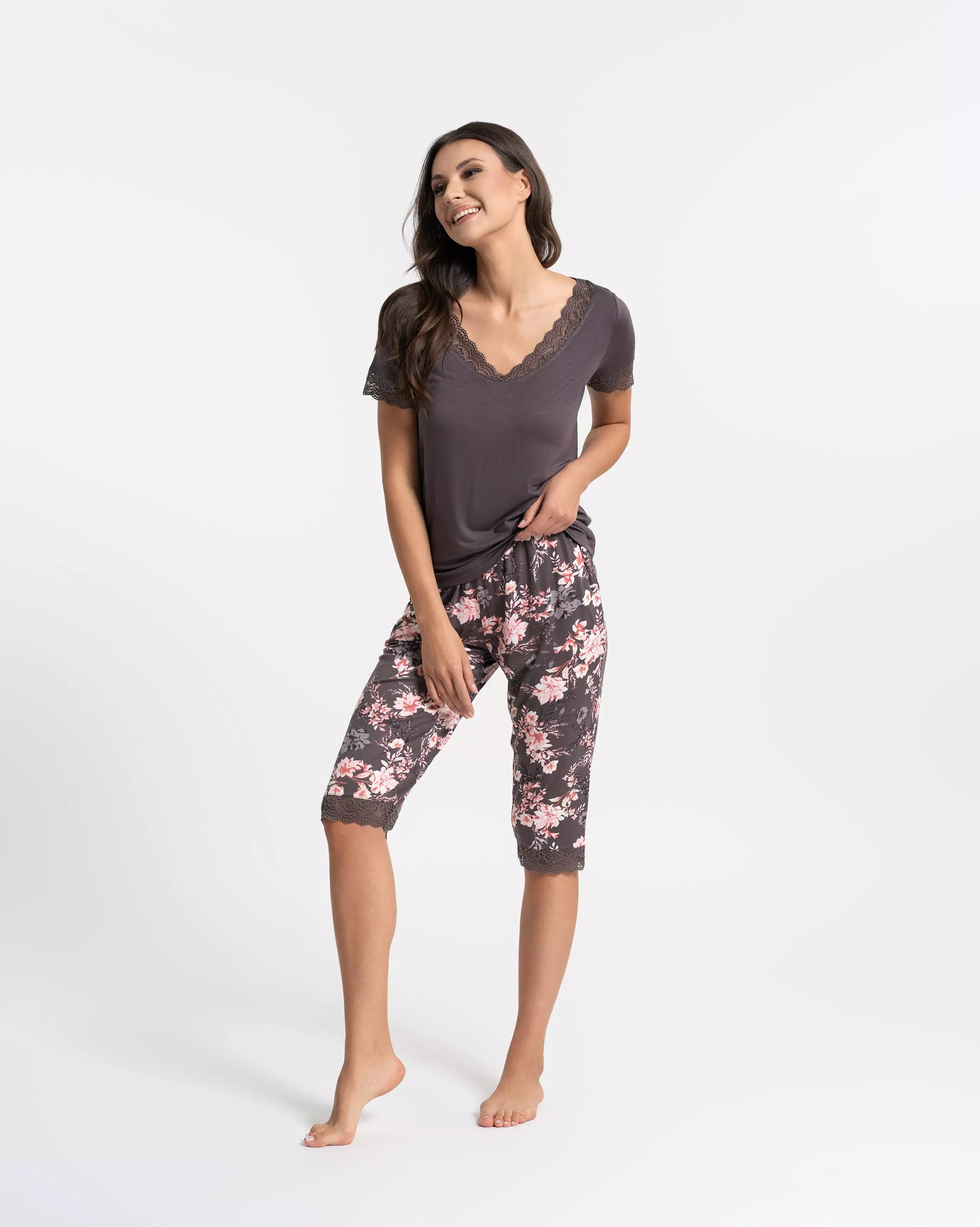 Šis moteriškas dviejų dalių pižamos komplektas sukurtas atsižvelgiant į maksimalų komfortą ir moterišką estetiką. Pagamintas iš 95 % viskozės ir 5 % elastano, jis yra išskirtinai minkštas, lengvas ir laidus orui, todėl puikiai tinka miegui ir poilsiui namuose. Lygią trumpų rankovių palaidinę papildo subtili nėrinių apdaila iškirptėje ir rankovėse, suteikianti subtilumo. 3/4 ilgio kelnės turi elastingą juosmens juostą ir praktiškas kišenes, užtikrinančias komfortą ir judėjimo laisvę. Šis komplektas derina funkcionalumą su rafinuotomis detalėmis.