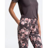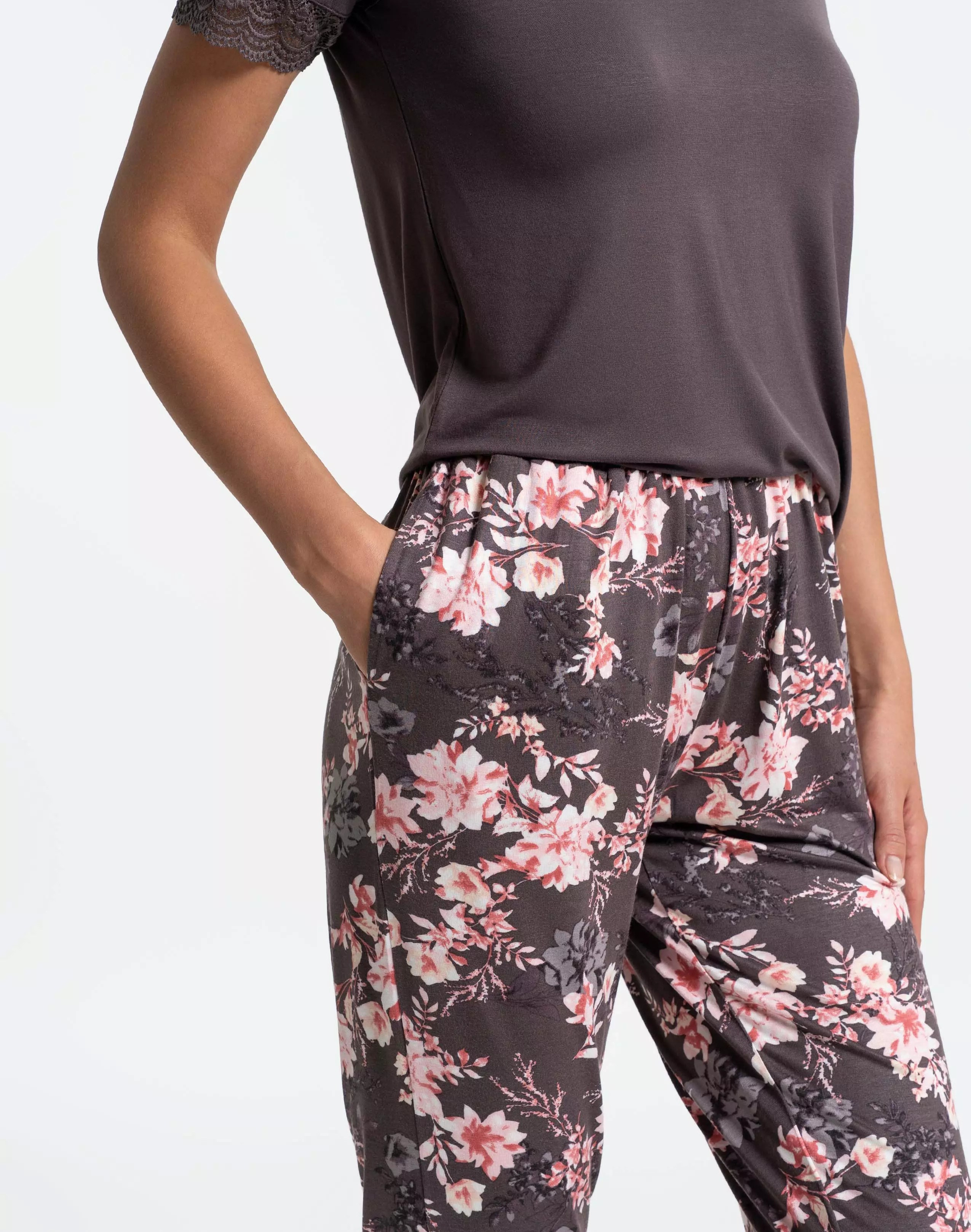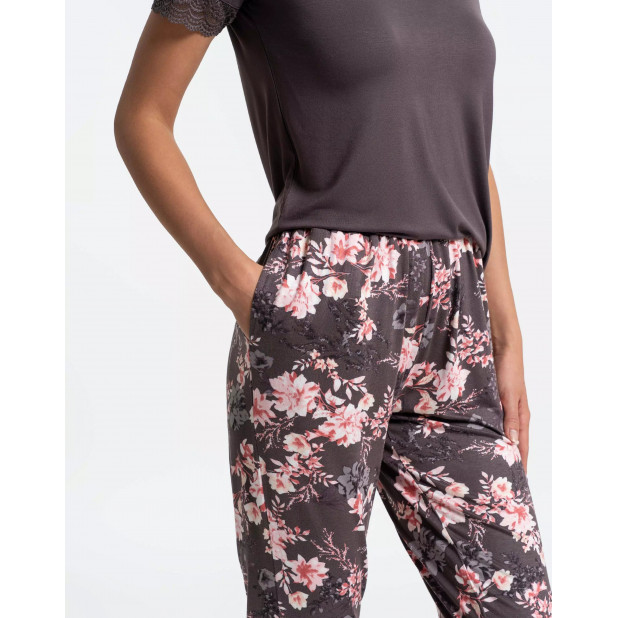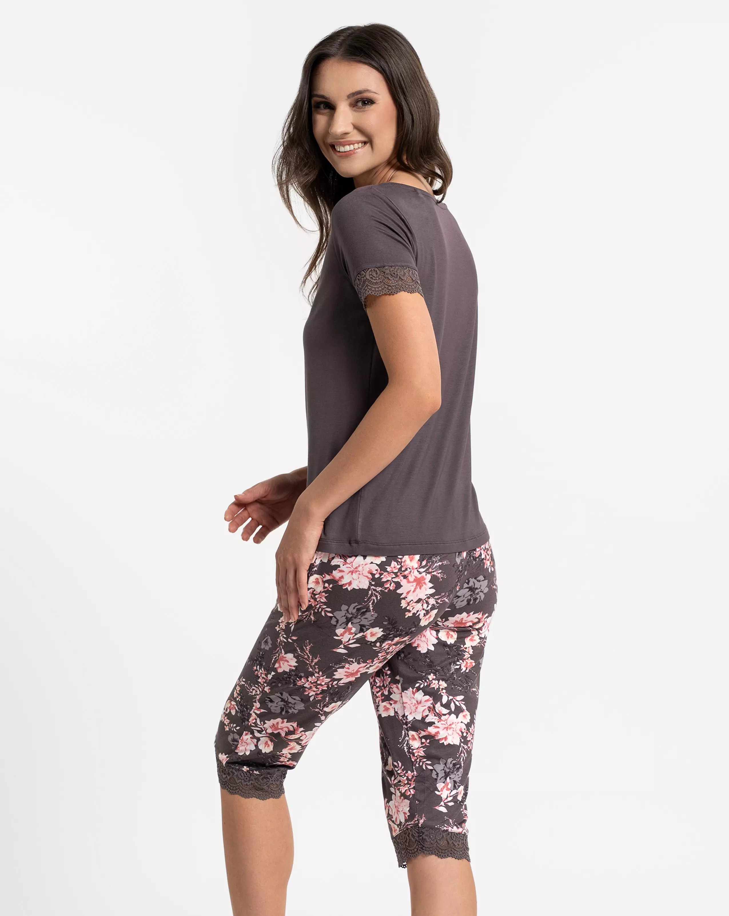 Šis moteriškas dviejų dalių pižamos komplektas sukurtas atsižvelgiant į maksimalų komfortą ir moterišką estetiką. Pagamintas iš 95 % viskozės ir 5 % elastano, jis yra išskirtinai minkštas, lengvas ir laidus orui, todėl puikiai tinka miegui ir poilsiui namuose. Lygią trumpų rankovių palaidinę papildo subtili nėrinių apdaila iškirptėje ir rankovėse, suteikianti subtilumo. 3/4 ilgio kelnės turi elastingą juosmens juostą ir praktiškas kišenes, užtikrinančias komfortą ir judėjimo laisvę. Šis komplektas derina funkcionalumą su rafinuotomis detalėmis.