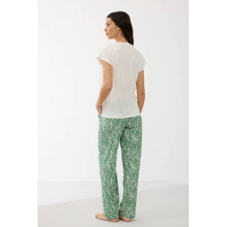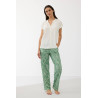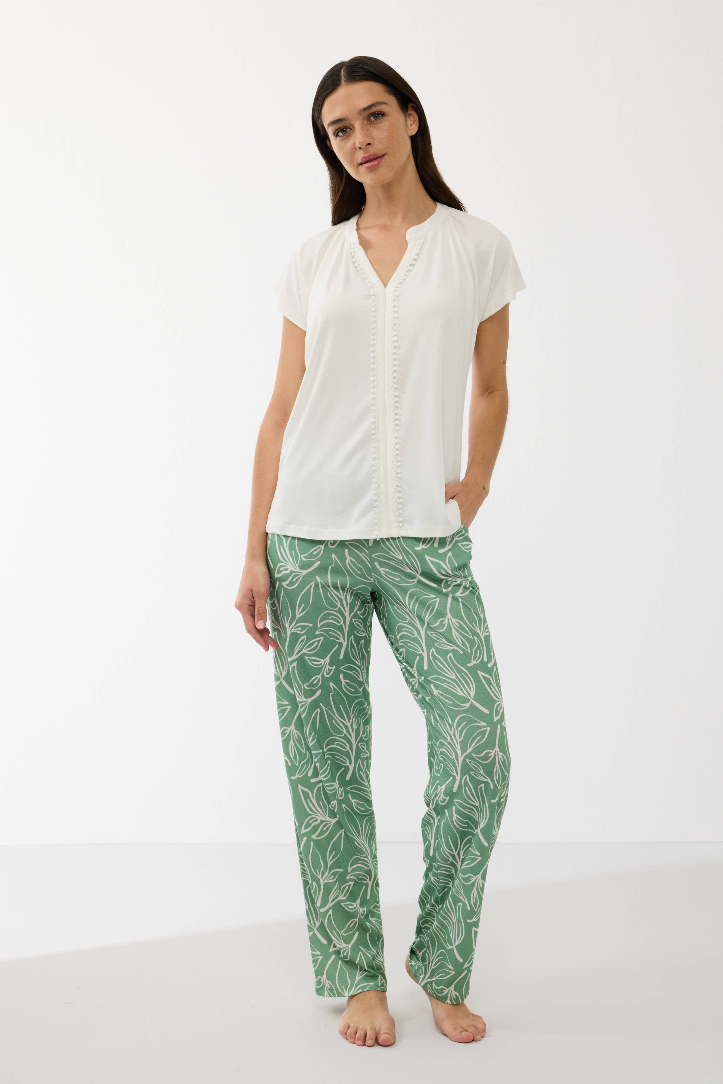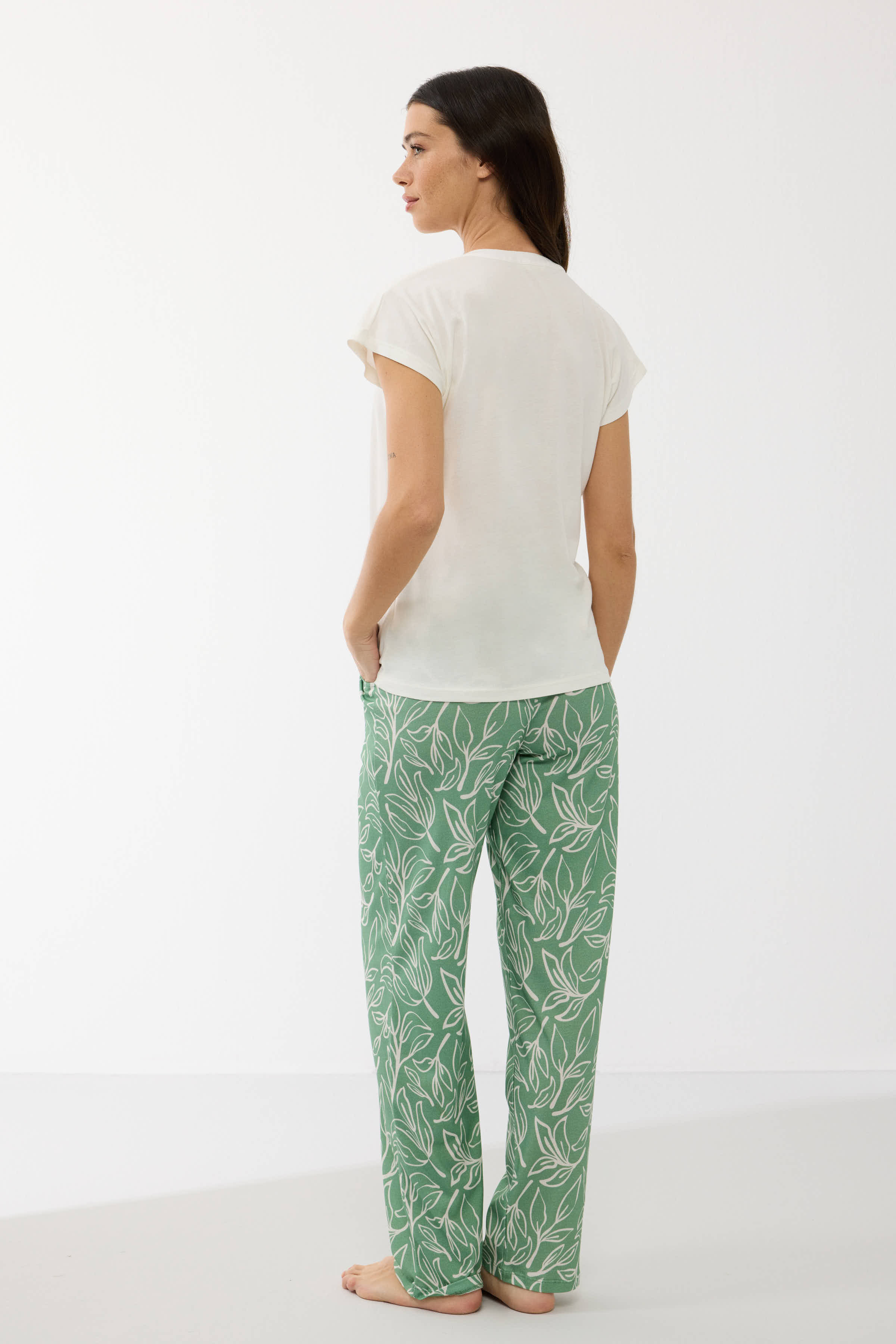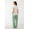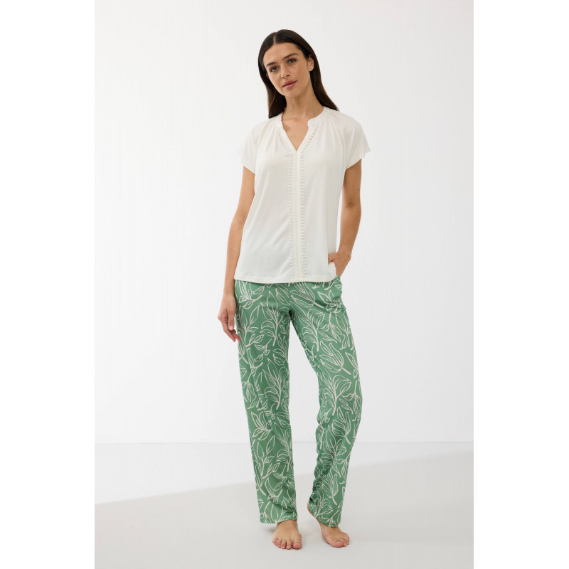 Kelnės – laisvo kirpimo, dekoruotos subtiliu augaliniu raštu žalios spalvos fone. Elastinga juosmens juosta užtikrina patogų prigludimą, o lengvai krintantis audinys nevaržo judesių.
