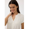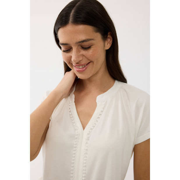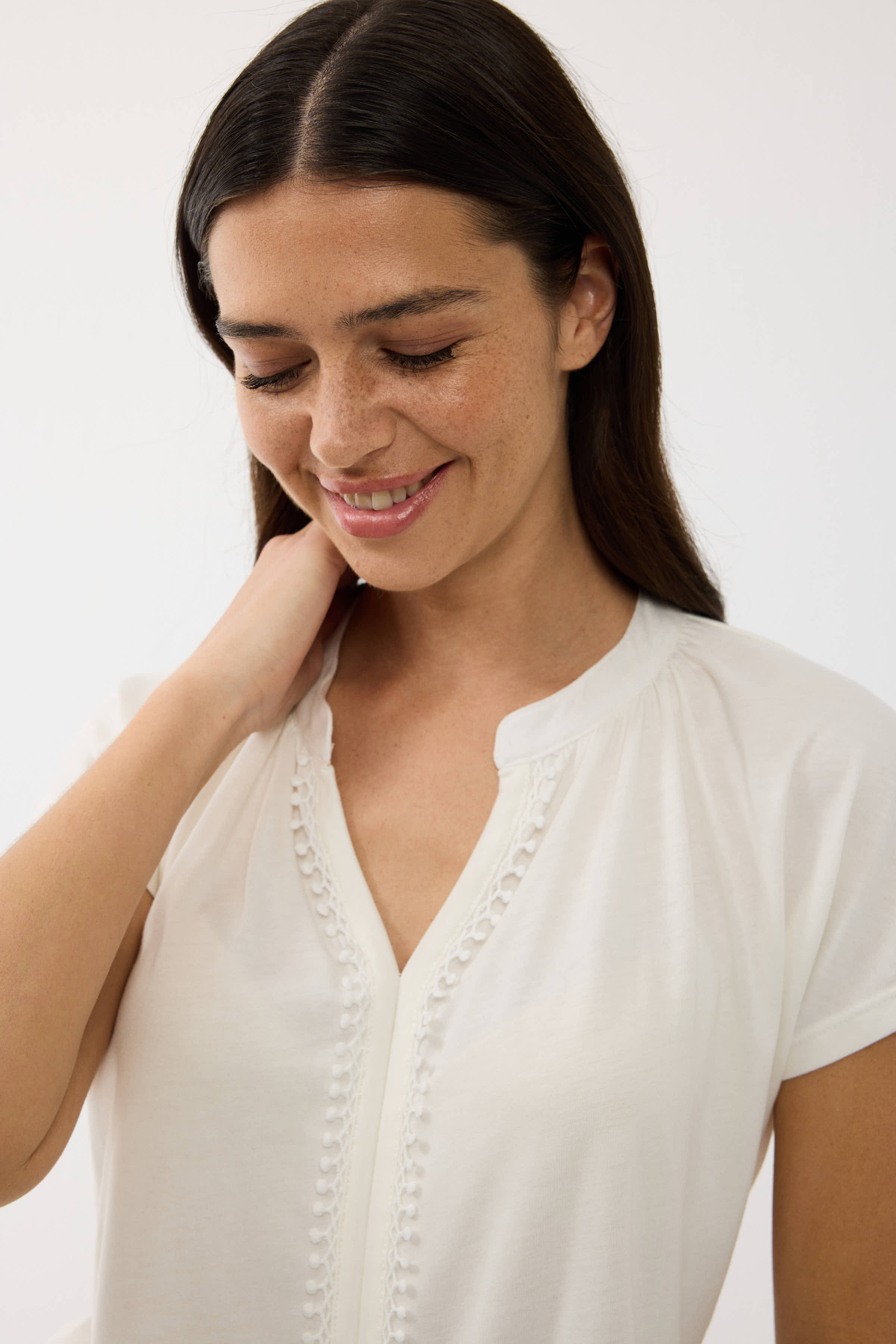 Viršutinė dalis – šviesi, minimalistinė, su trumpomis rankovėmis ir dekoratyvine iškirpte. Švelnus audinys suteikia lengvumo pojūtį ir maloniai priglunda prie kūno.