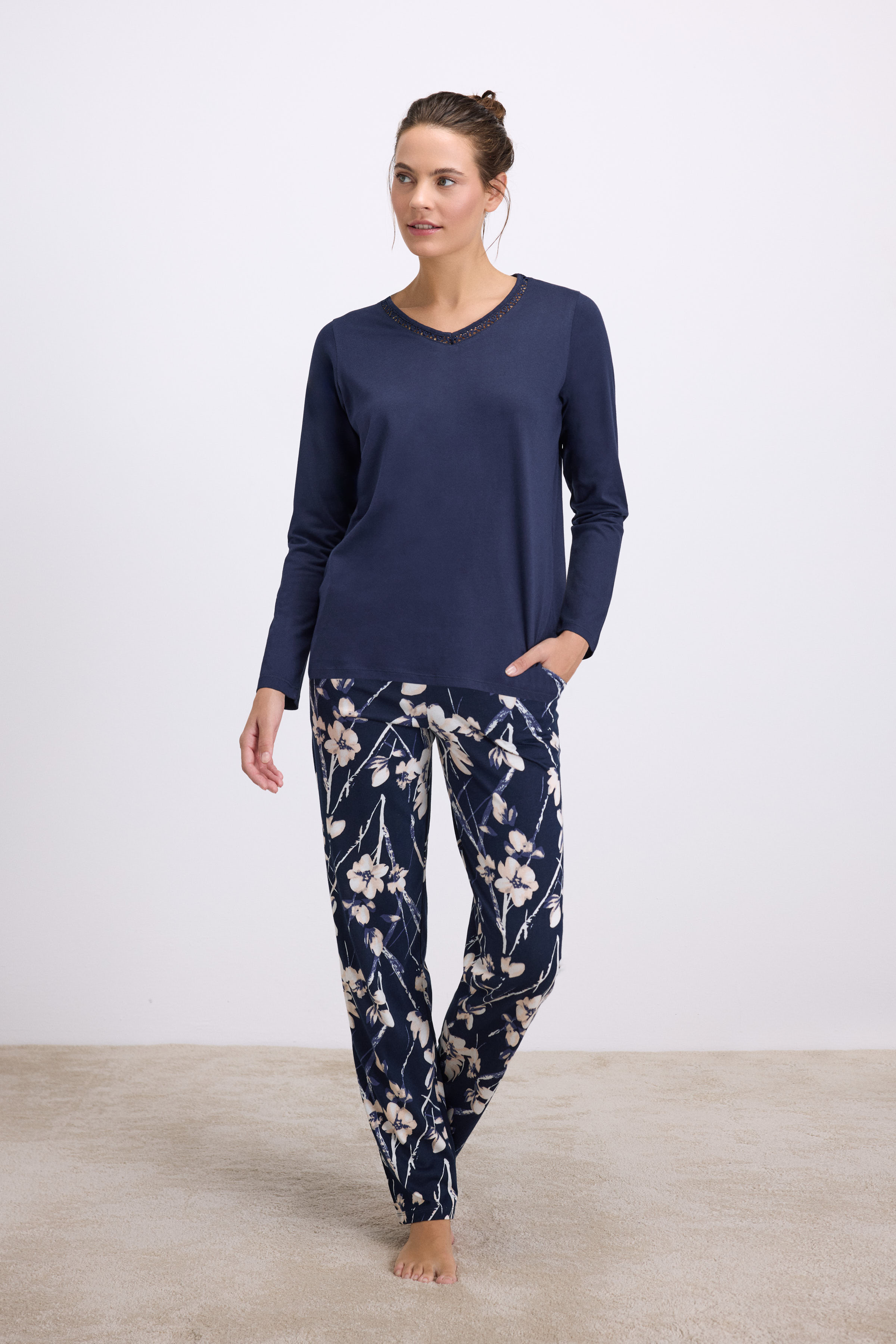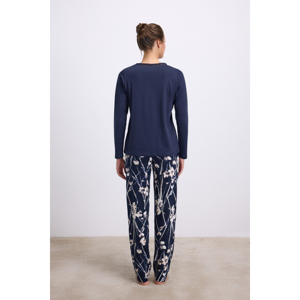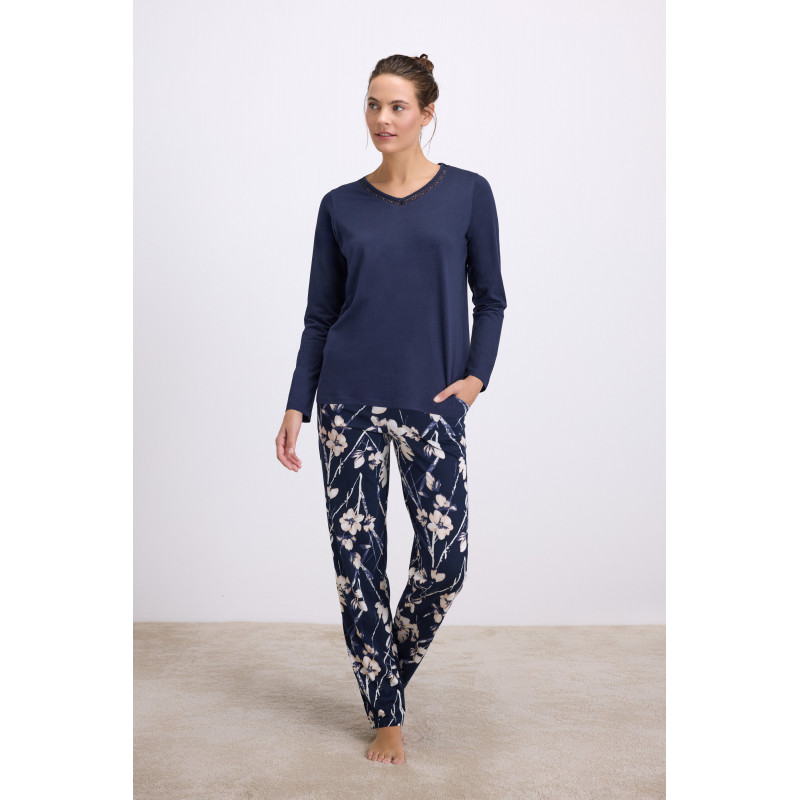 Dviejų dalių moteriška pižama pagaminta iš labai švelnaus, malonaus kūnui, kokybiško trikotažo. Marškinėliai ilgomis rankovėmis, apykaklė puošta nėriniu. Kelnės tiesaus modelio, su kišenėmis. Pižama patogi miegoti ir vaikščioti namuose.