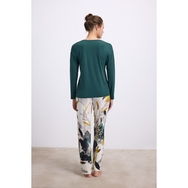 Dviejų dalių moteriška pižama pagaminta iš labai švelnaus, malonaus kūnui, kokybiško viskozinio audinio. Marškinėliai ilgomis rankovėmis. Kelnės tiesaus modelio, su kišenėmis. Pižama patogi miegoti ir vaikščioti namuose.