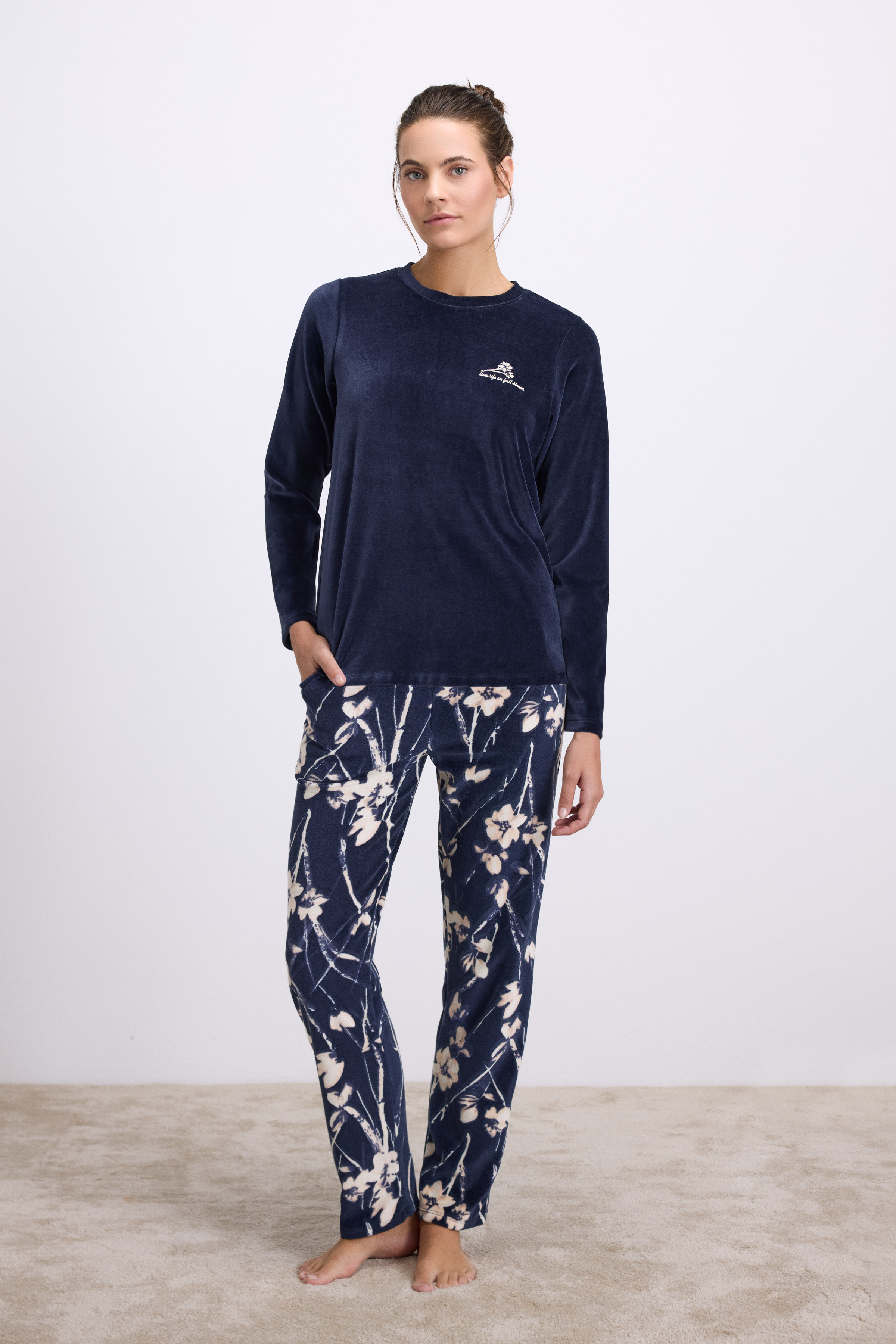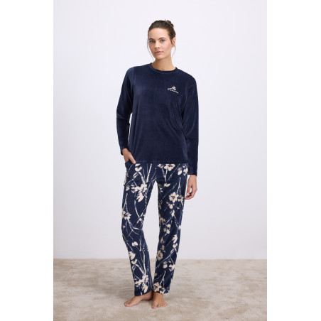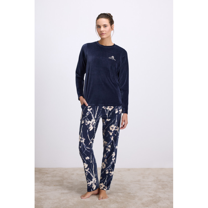 Minkšta, jauki ir elegantiška pižama idealiai tinkanti šaltąjam metų laikui ar ramiems vakarams namuose. Viršus tamsiai mėlyno veliūro puoštas išsiuvinėta gėlės aplikacija. Kelnės laisvo kirpimo, su kišenėmis, pasiūtos iš tamsiai mėlyno veliūro marginto šviesių gėlių raštu.