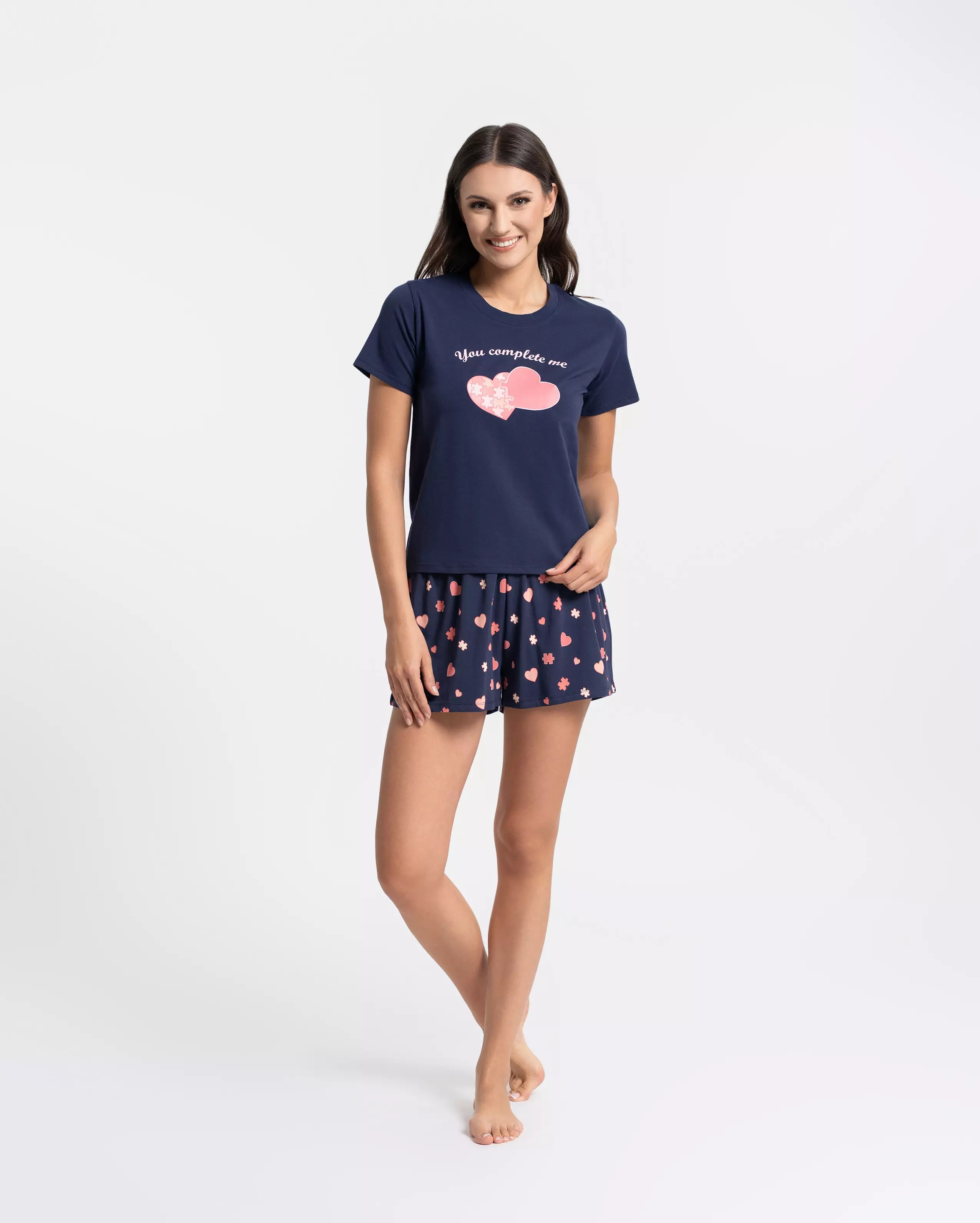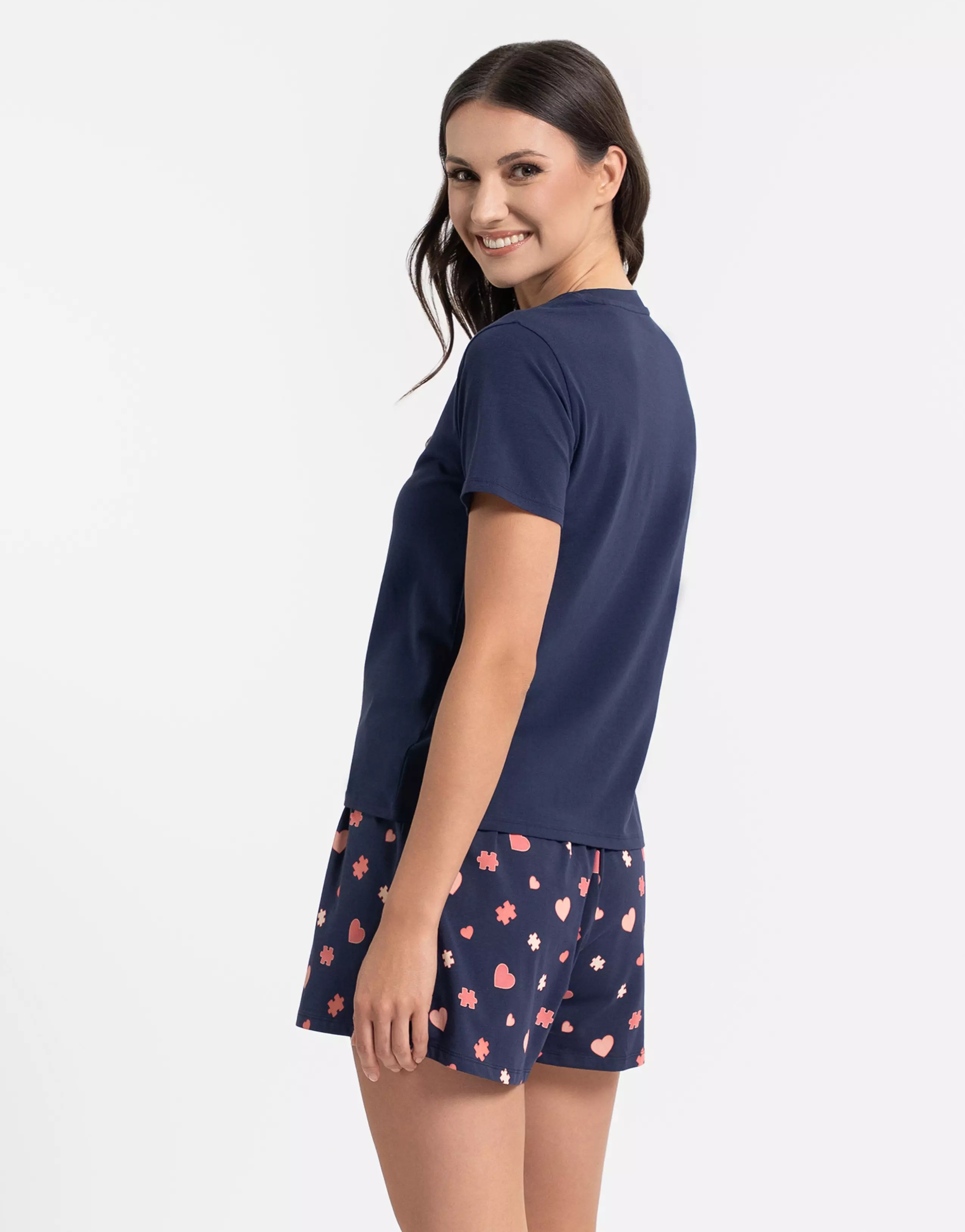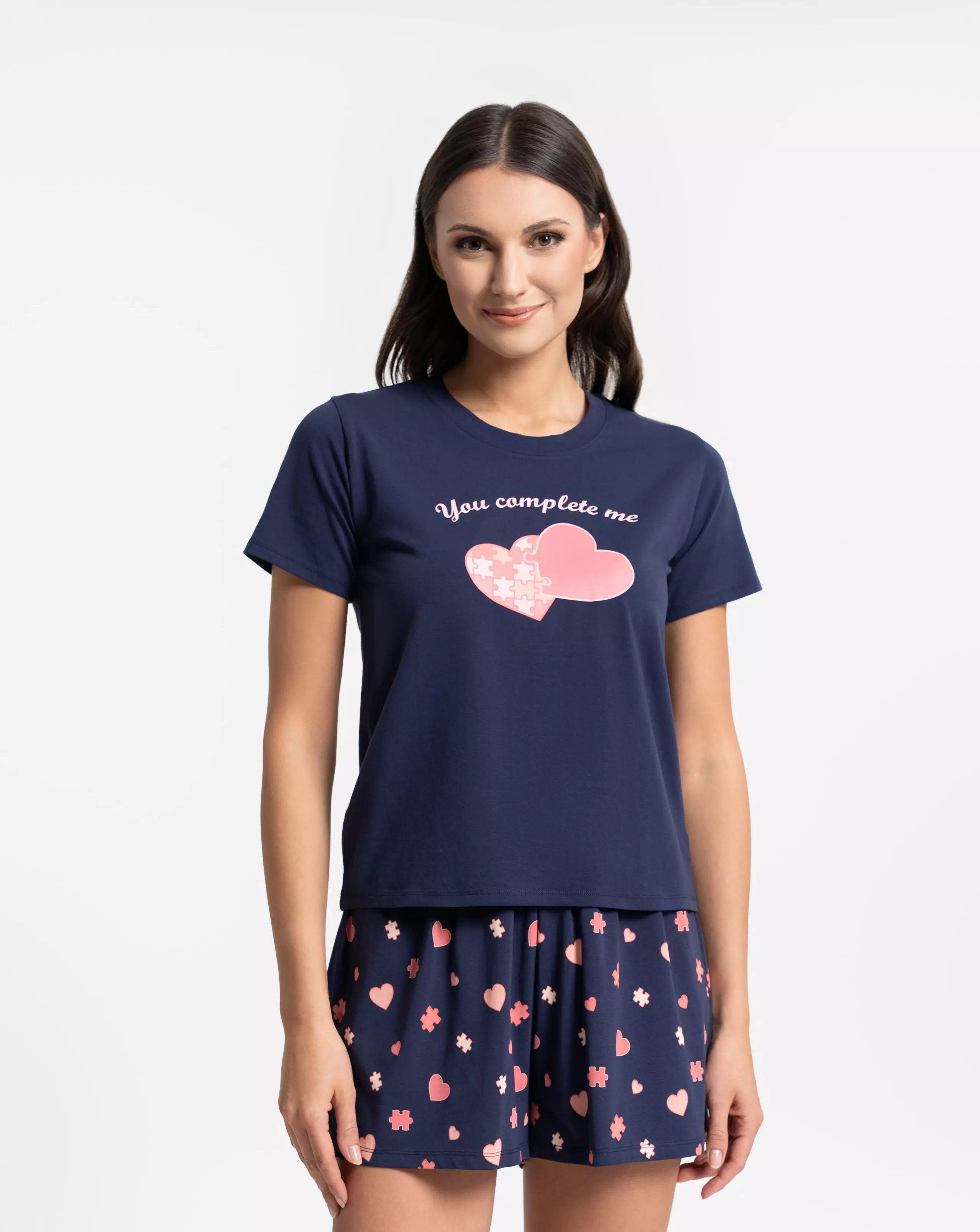 Šis žavingas moteriškas trumpomis rankovėmis pižamos komplektas su šortais derina patogumą ir stilių, užtikrindamas patogumą kiekvieną naktį. Pagamintas iš aukštos kokybės medvilnės su elastano mišinio, jis yra tamprus, gerai priglunda ir patvarus. Marškinėliai su linksmu širdelių ir dėlionės raštu bei mieli šortai puikiai tinka šiltoms naktims.