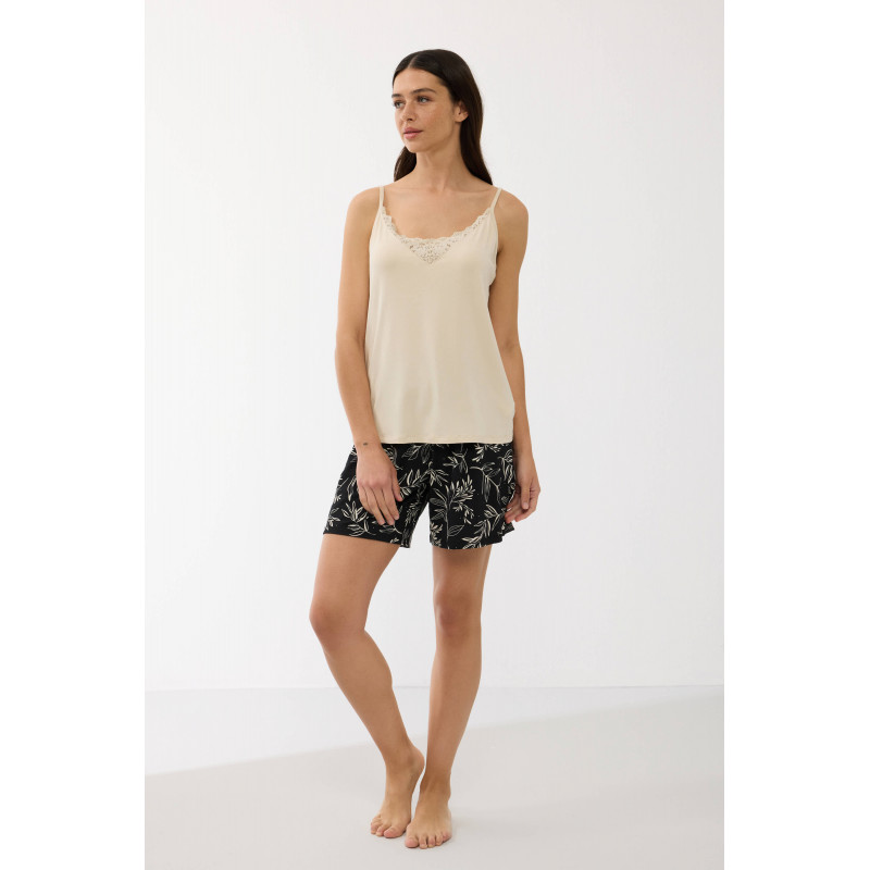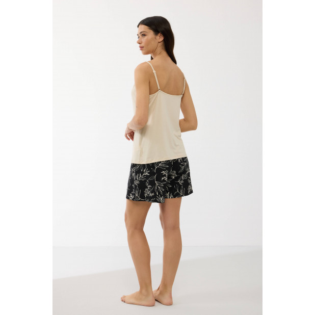 Ši elegantiška dviejų dalių pižama sukurta moterims, vertinančioms komfortą ir subtilų dizainą. Komplektą sudaro švelnus viršus su nėriniais ir lengvi šortai su stilingu raštu.