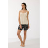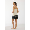 Šortai – tamsaus atspalvio su šviesiu augaliniu raštu, laisvo kirpimo, todėl nevaržo judesių ir užtikrina maksimalų patogumą. Elastinga juosmens juosta prisitaiko prie kūno ir suteikia dar daugiau komforto.