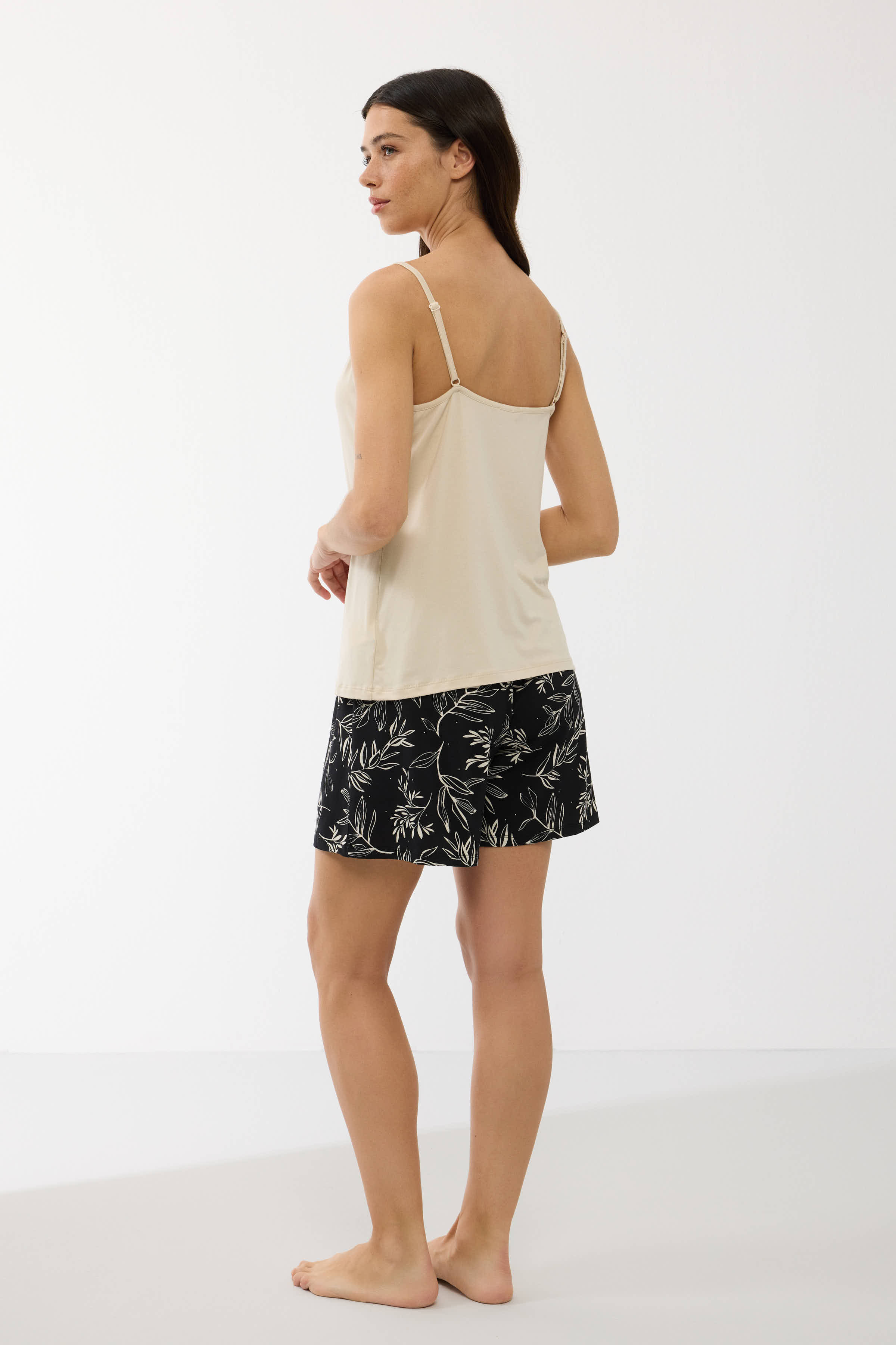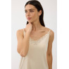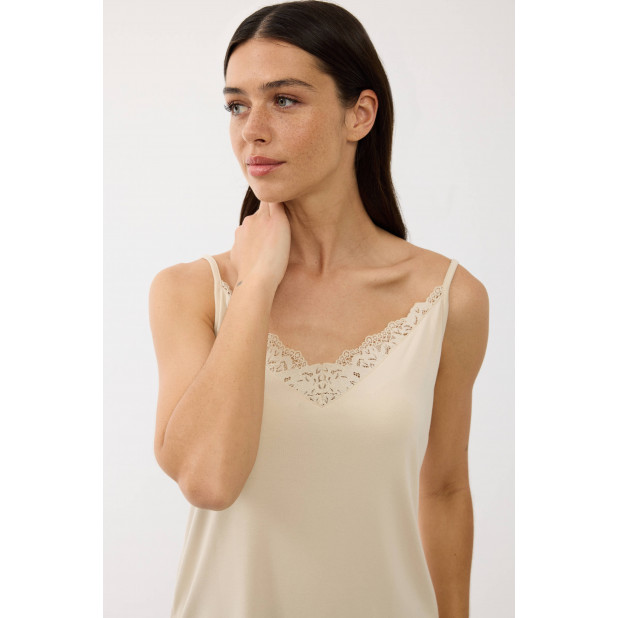 Viršutinė dalis – kreminės spalvos, su plonomis petnešėlėmis ir subtiliais nėriniais ties iškirpte, kurie suteikia romantiškumo ir moteriškumo. Minkštas audinys maloniai priglunda prie kūno ir leidžia odai kvėpuoti.