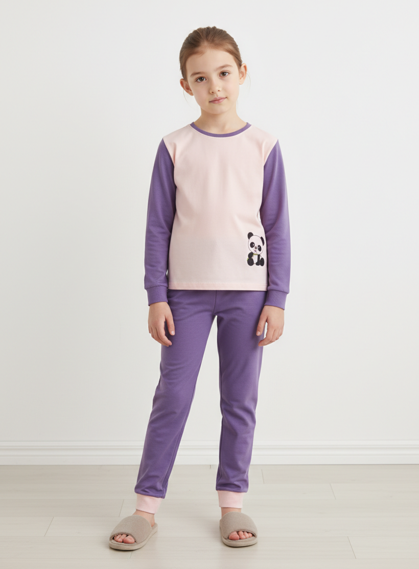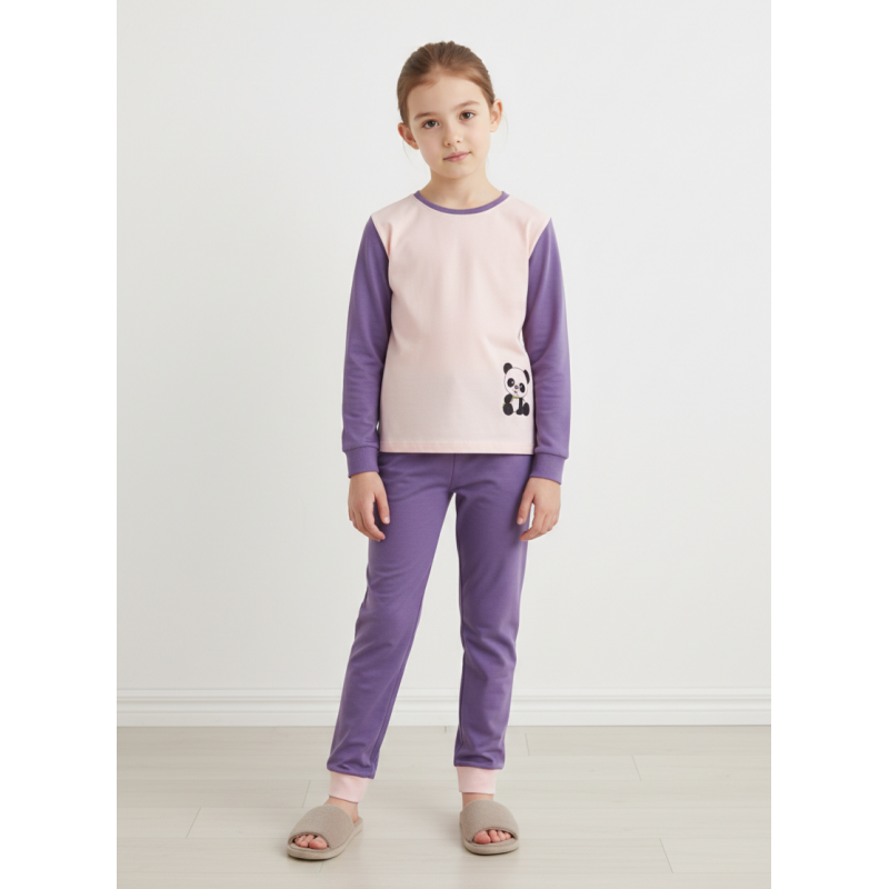 Mergaičių pižama su pandos aplikacija iš bambuko pluošto. Audinys švelnus ir minkštas, todėl labai maloni dėvėti. Drabužiai iš bambuko pluošto praleidžia orą karštu metu ir palaiko šilumą kai šalta.