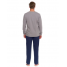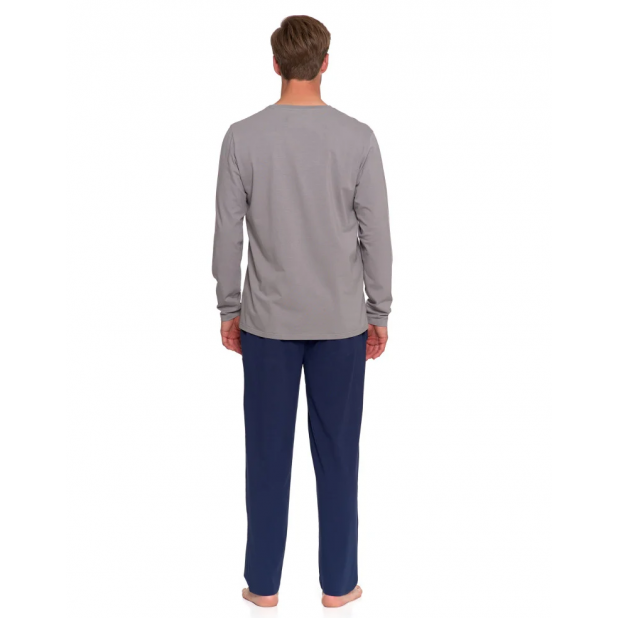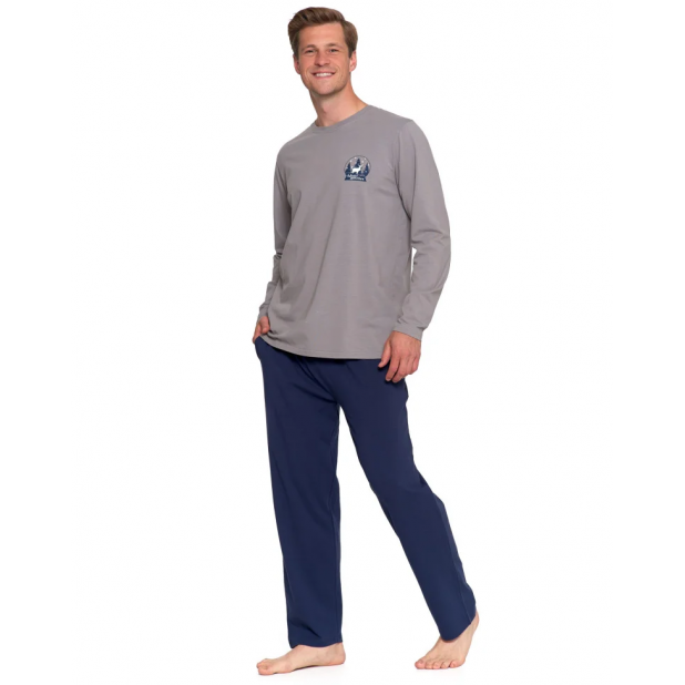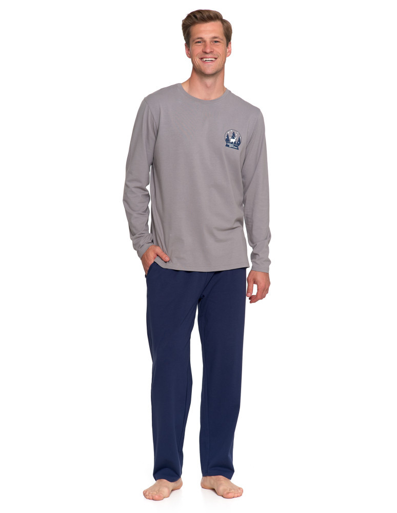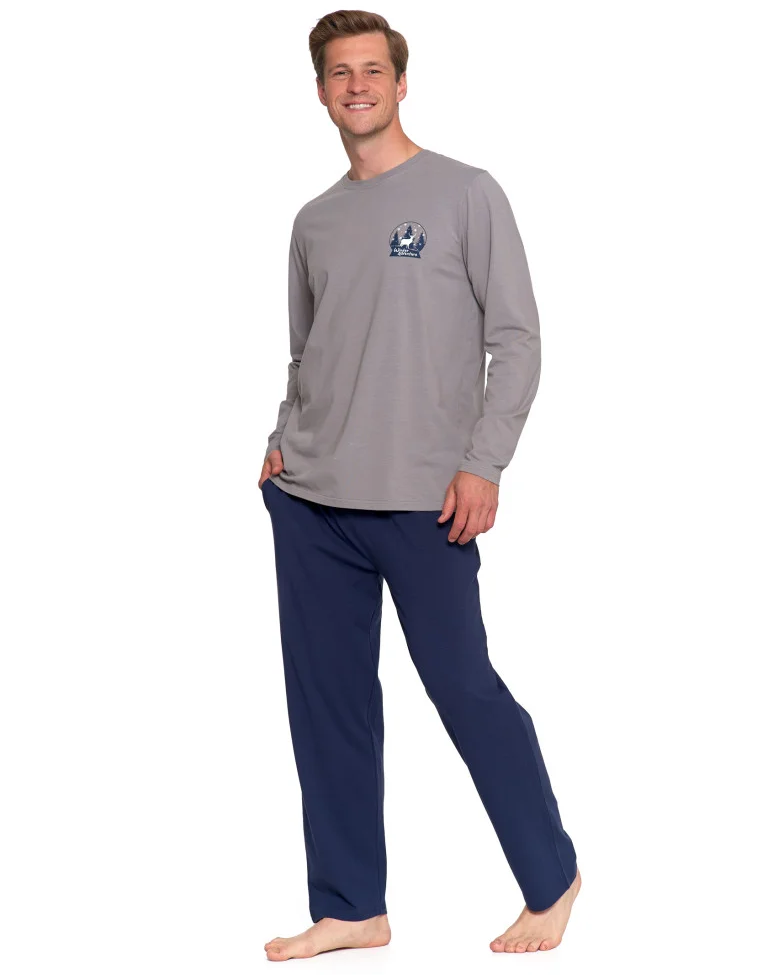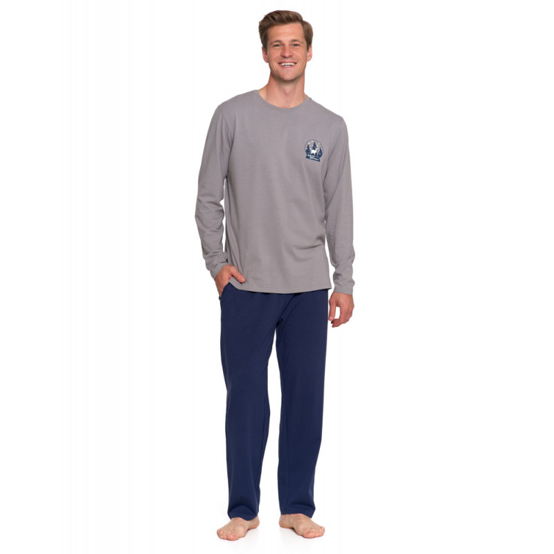 Vyriška ilgomis rankovėmis pižama iš minkštos, kvėpuojančios medvilnės, puikiai tinkanti bet kokiam metų laikui. Viršutinė dalis, vėsaus pilko atspalvio ir papuošta subtiliu „Žiemos nuotykių“ aplikacija ant krūtinės. Klasikinis dizainas su apvalia iškirpte užtikrina paprastumą ir patogumą. Tamsiai mėlynos, lygios kelnės su tampria juosmens juosta – be papildomų raištelių, užtikrina patogumą dėvint.