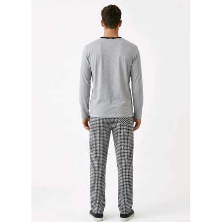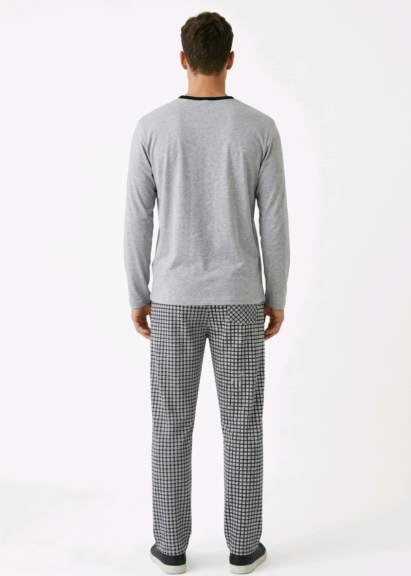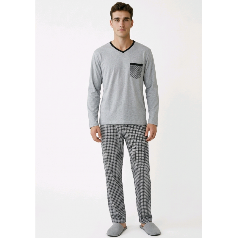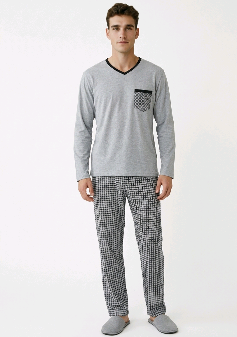 Moderni ir patogi vyriška pižama, sukurta jaukiam poilsiui ir kokybiškam miegui. Minimalistinis viršutinės dalies dizainas puikiai dera su išskirtinio rašto kelnėmis, suteikdamas stilingą ir tvarkingą namų įvaizdį.