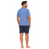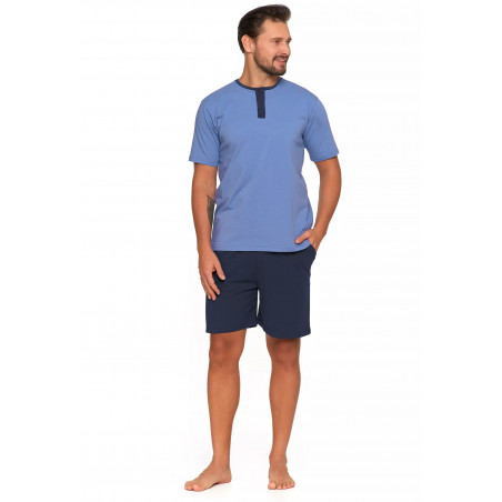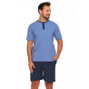 Šį dviejų dalių vyrišką pižamos komplektą sudaro trumpomis rankovėmis marškinėliai su klasikine, apvalia iškirpte ir trijų sagų užsegimu, suteikiančiu jai charakterio. Subtilios džinsinės mėlynos spalvos marškinėliai puikiai dera su paprastais tamsiai mėlynais šortais, tiesaus kirpimo. Elastinė juosmens juosta ir kontrastingi raišteliai užtikrina tobulą prigludimą ir patogų dėvėjimą.